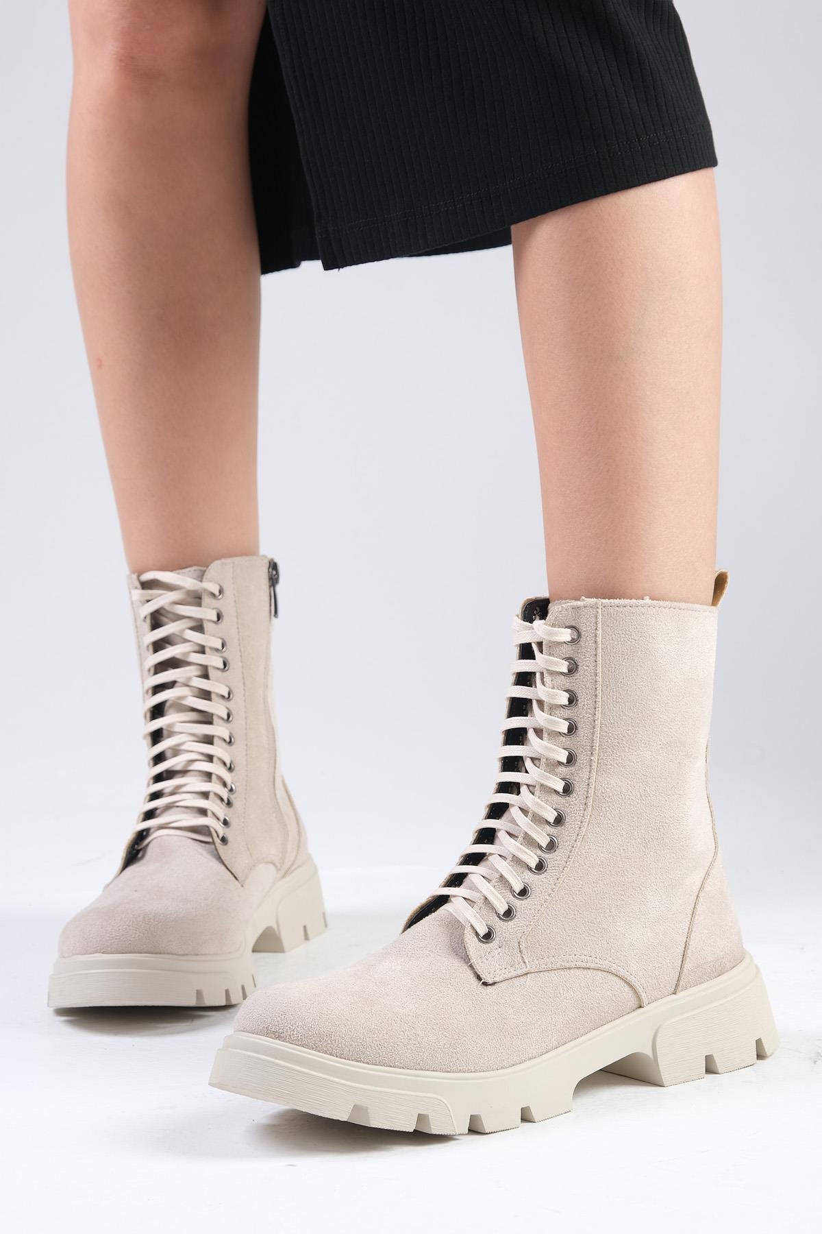 • Bej renk, yandan fermuarlı ve bağcıklı, ince suni kürk astarlı, kalın tabanlı postal bot