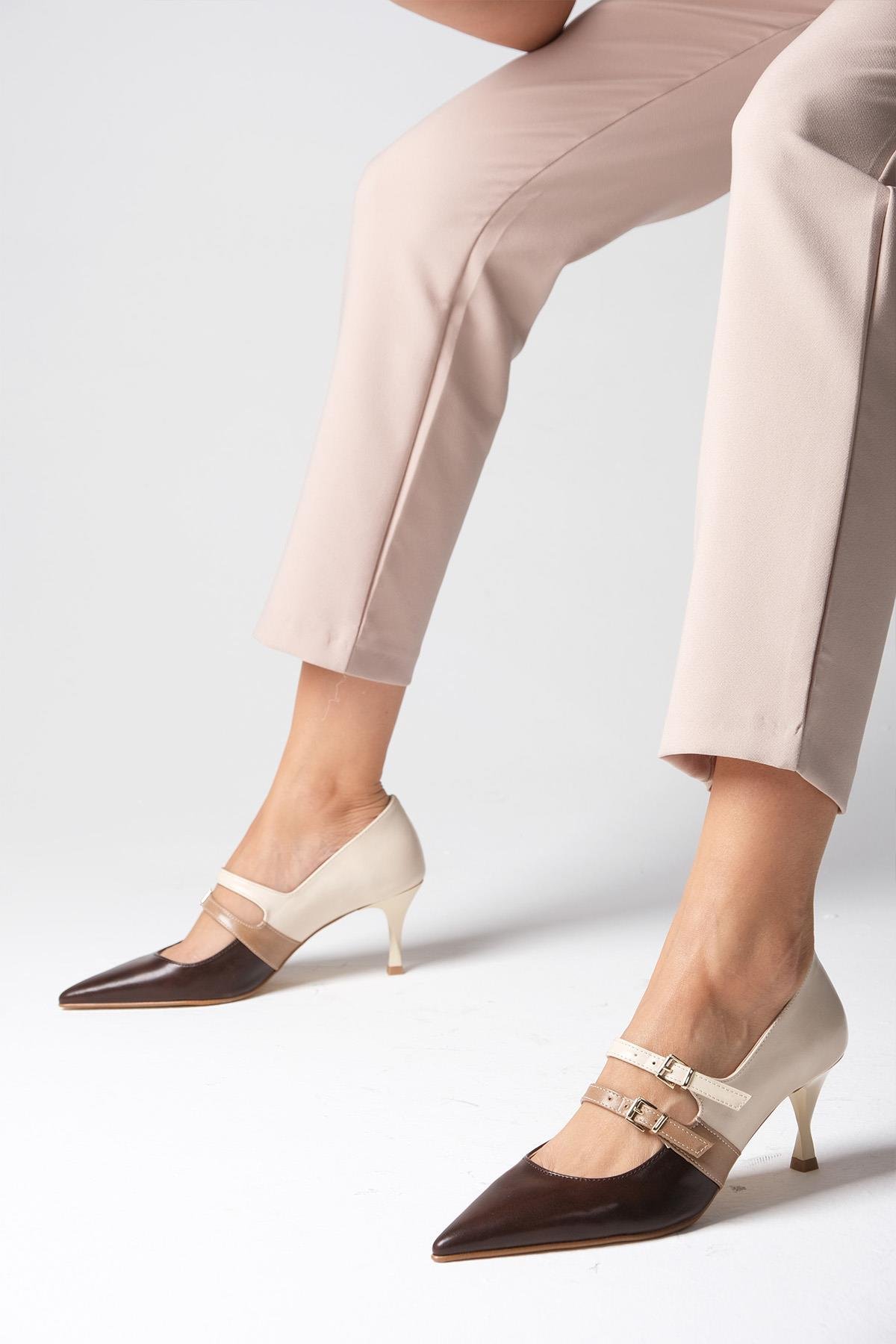 • Kahverengi , çift bantlı topuklu ayakkabı