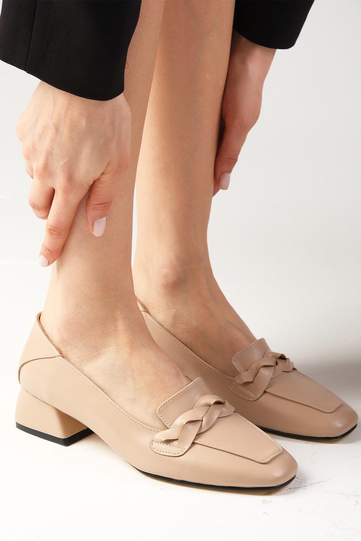 • Taba renk, küt burunlu, örgü bantlı kısa topuklu ayakkabı.