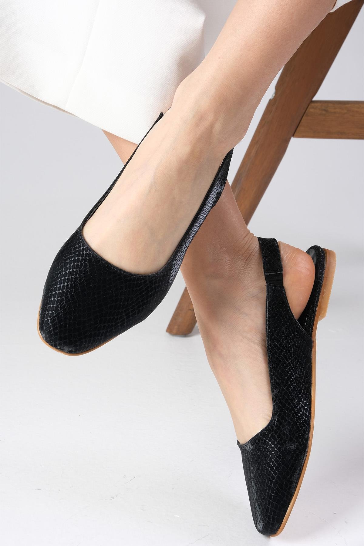 Ally Siyah Renk Yılan Derisi Desenli Küt Burun Babet (02232BLK)