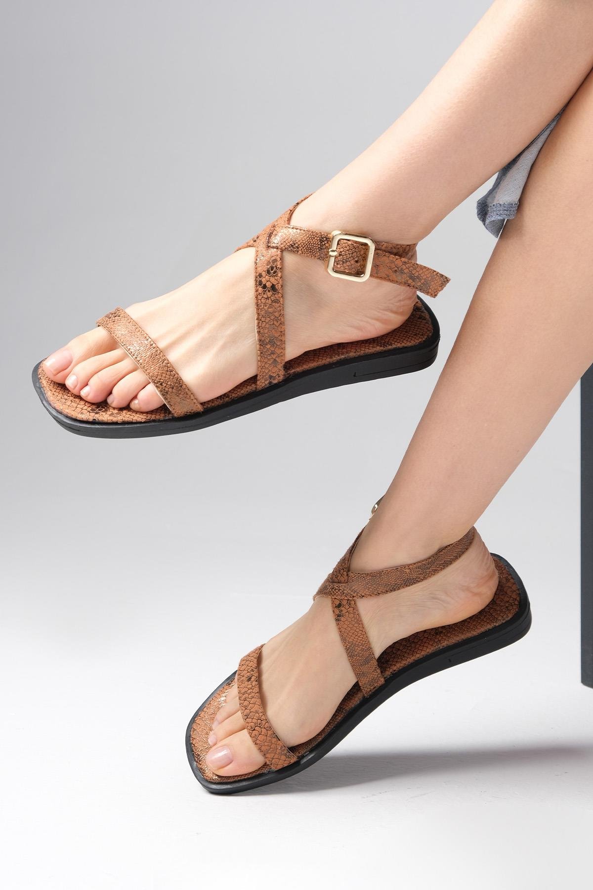 Arely Taba Renk Yılan Desenli Düz Sandalet (02354TAX)