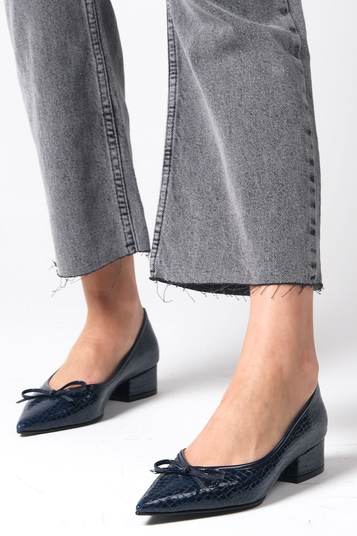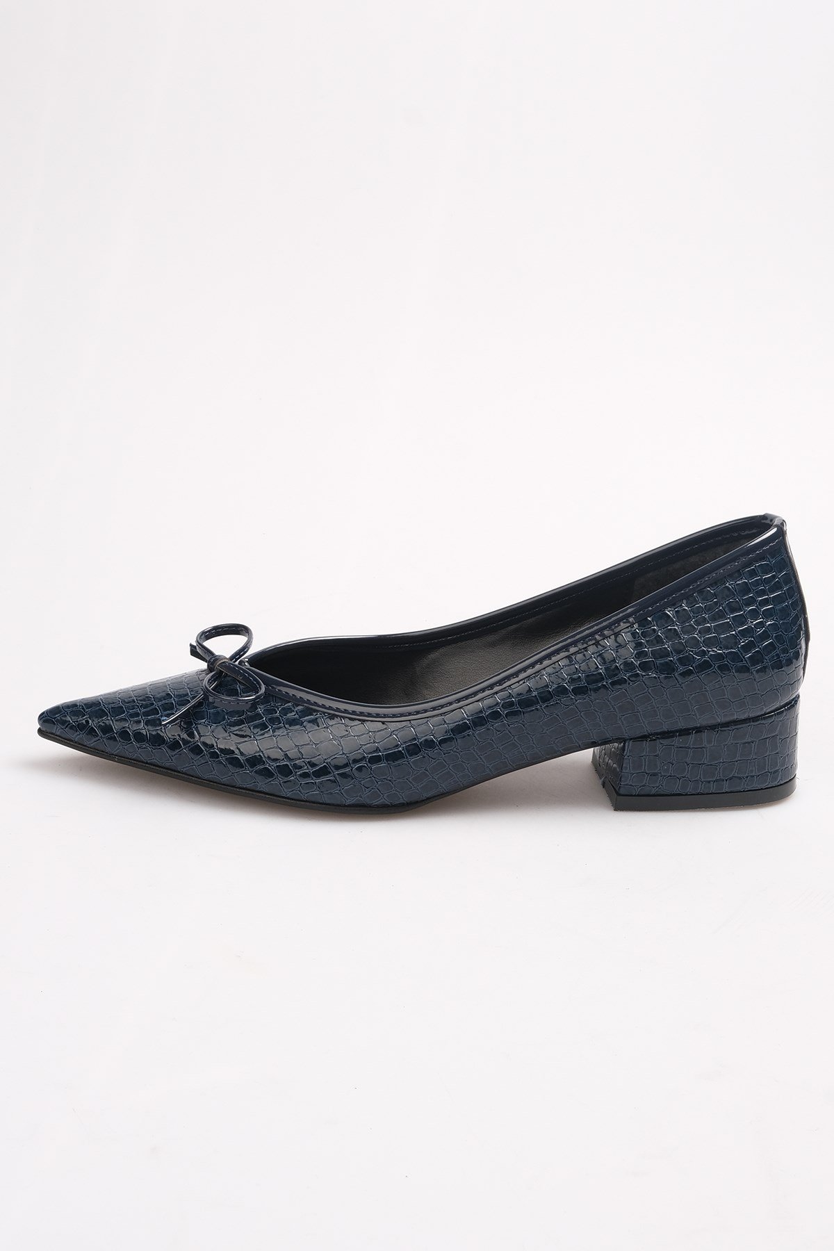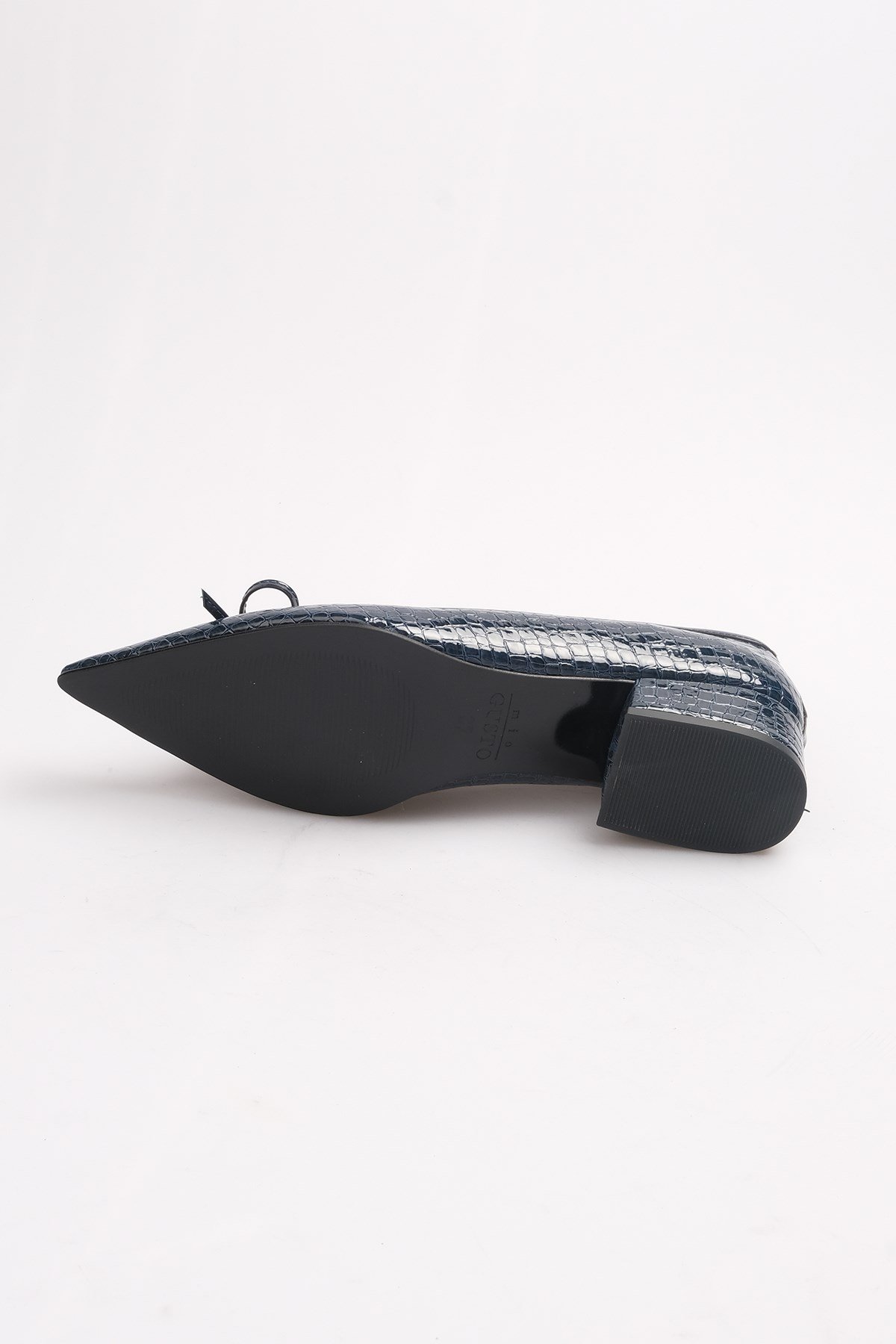 • Lacivert renk yılan desenli, fiyonk akseuarlı, kısa topuklu ayakkabı.
