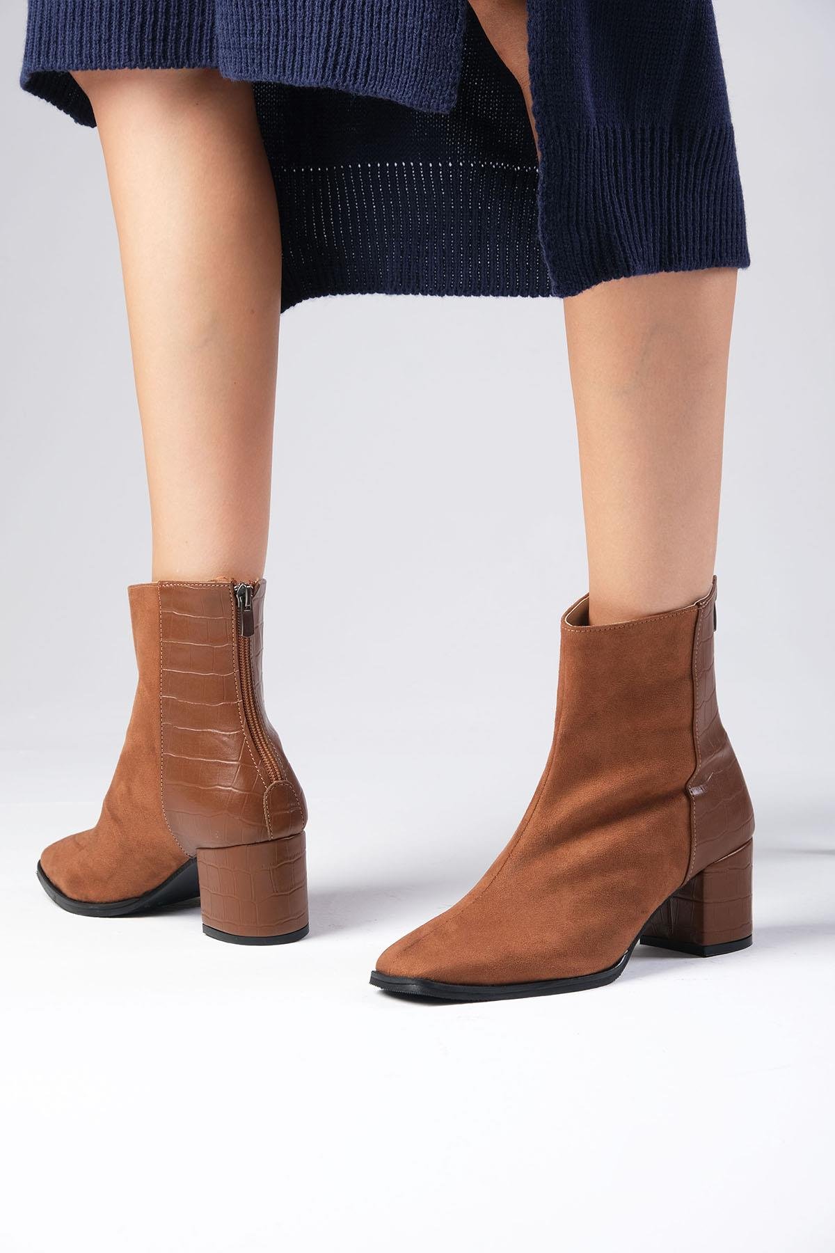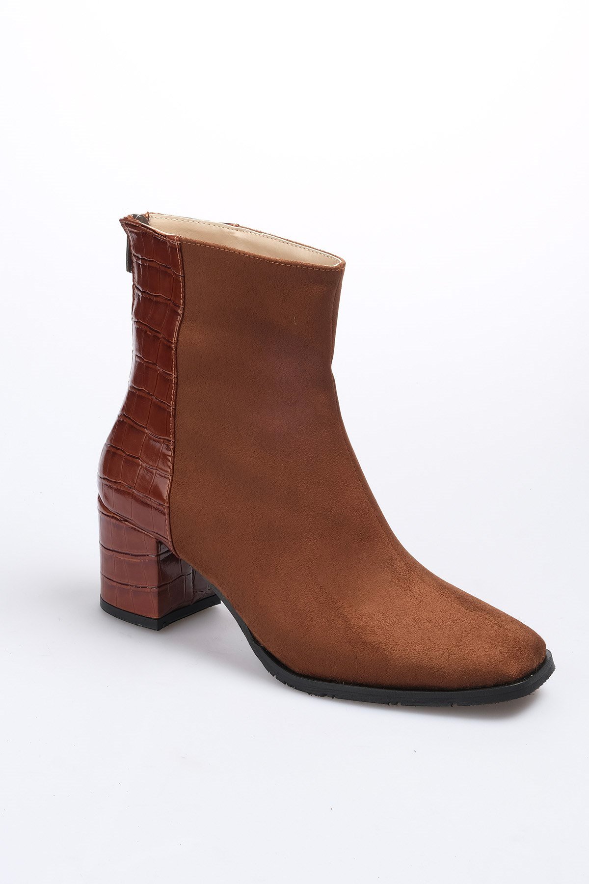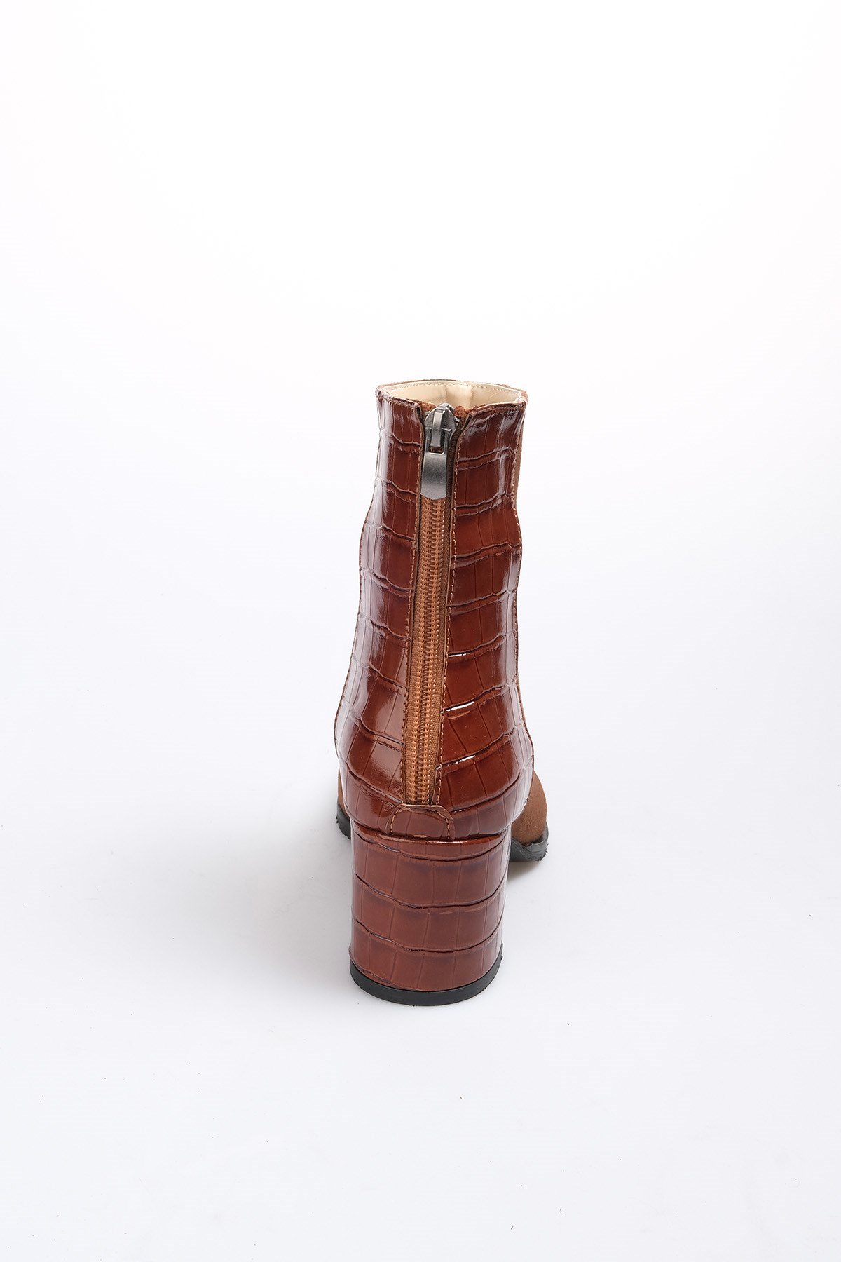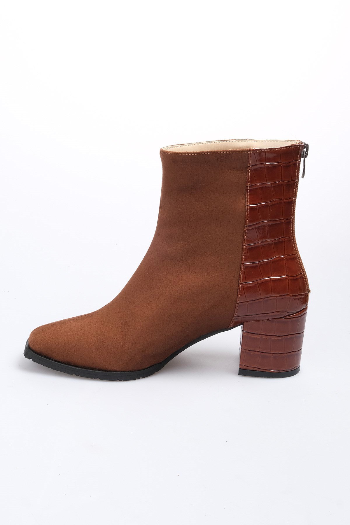 • Taba renk, ince suni kürk astarlı, süet ve krokodil desen kombinasyonlu kalın topuklu küt burunlu bot.