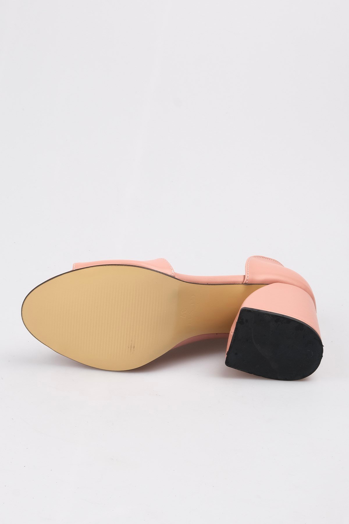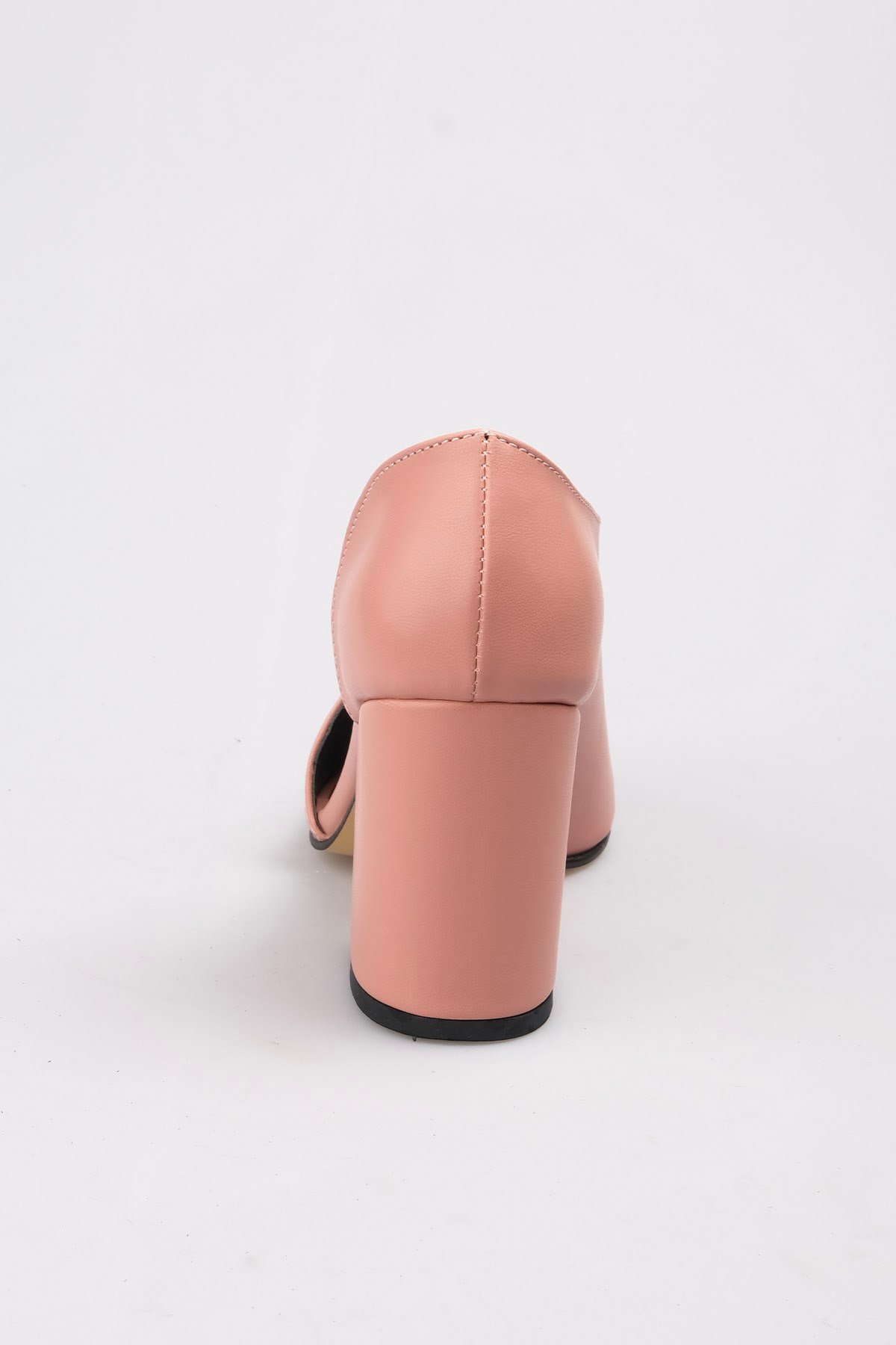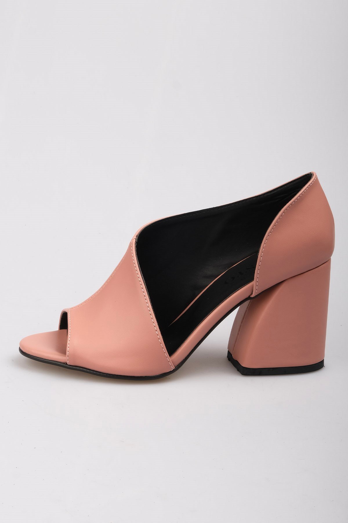 Pudra asimetrik kesimli kalın topuklu ayakkabı. Topuk yüksekliği 9 cm. Üretim yeri Türkiye.