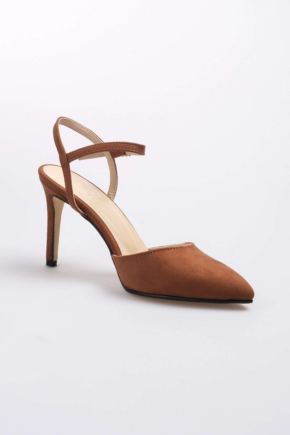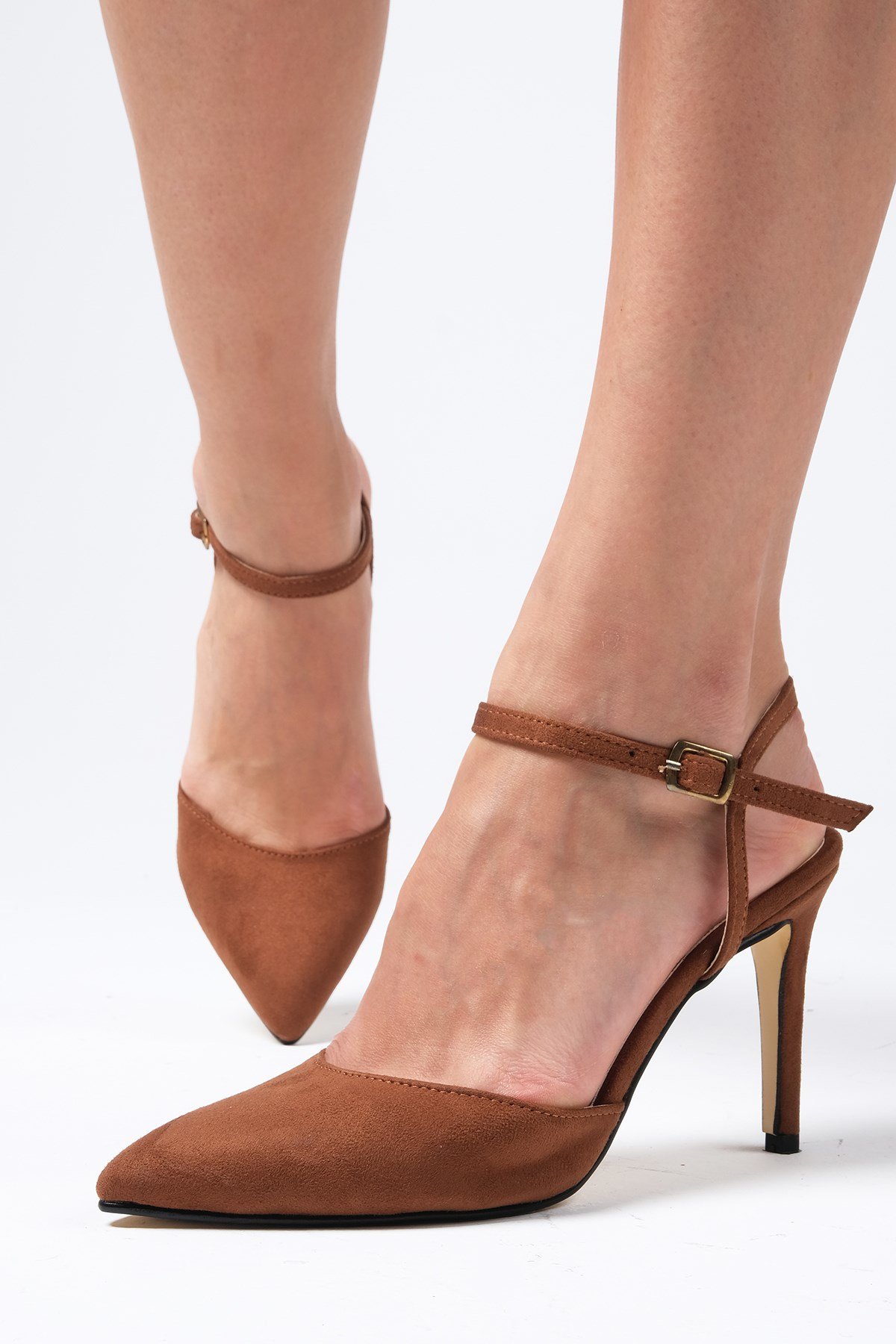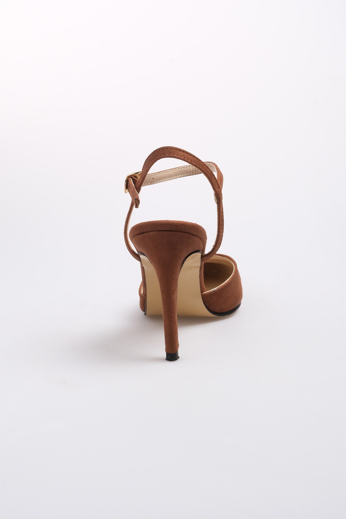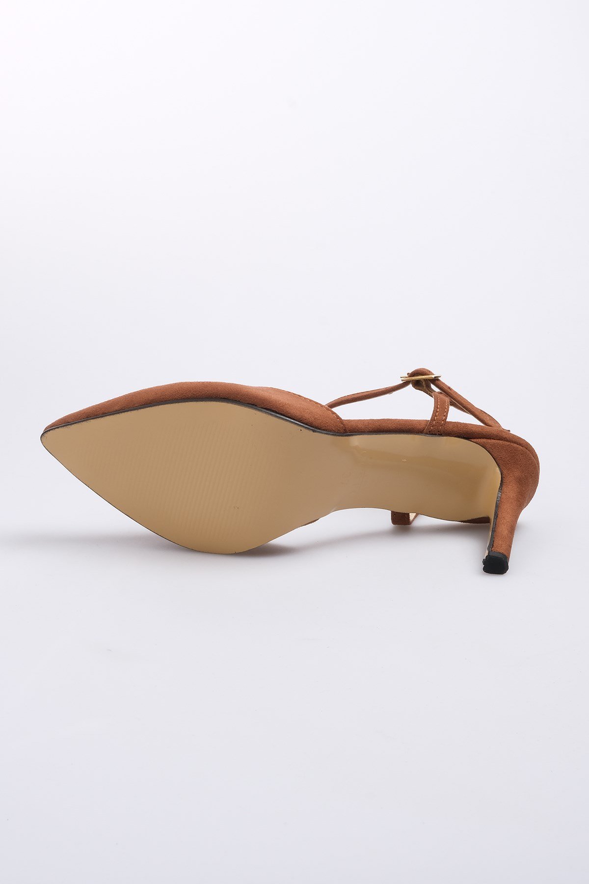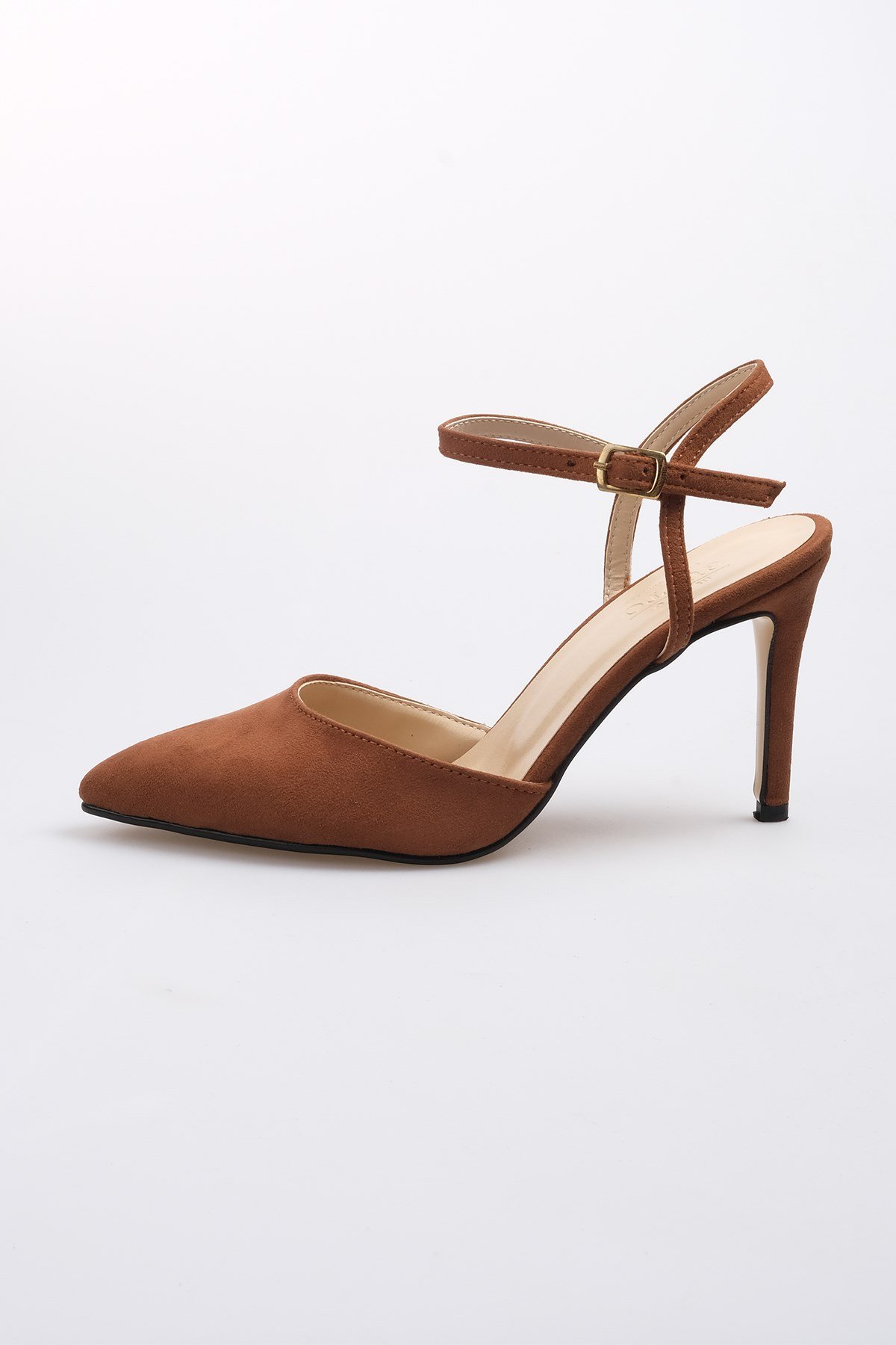 • Taba renk süet, bilek bantlı, yandan tokalı topuklu ayakkabı