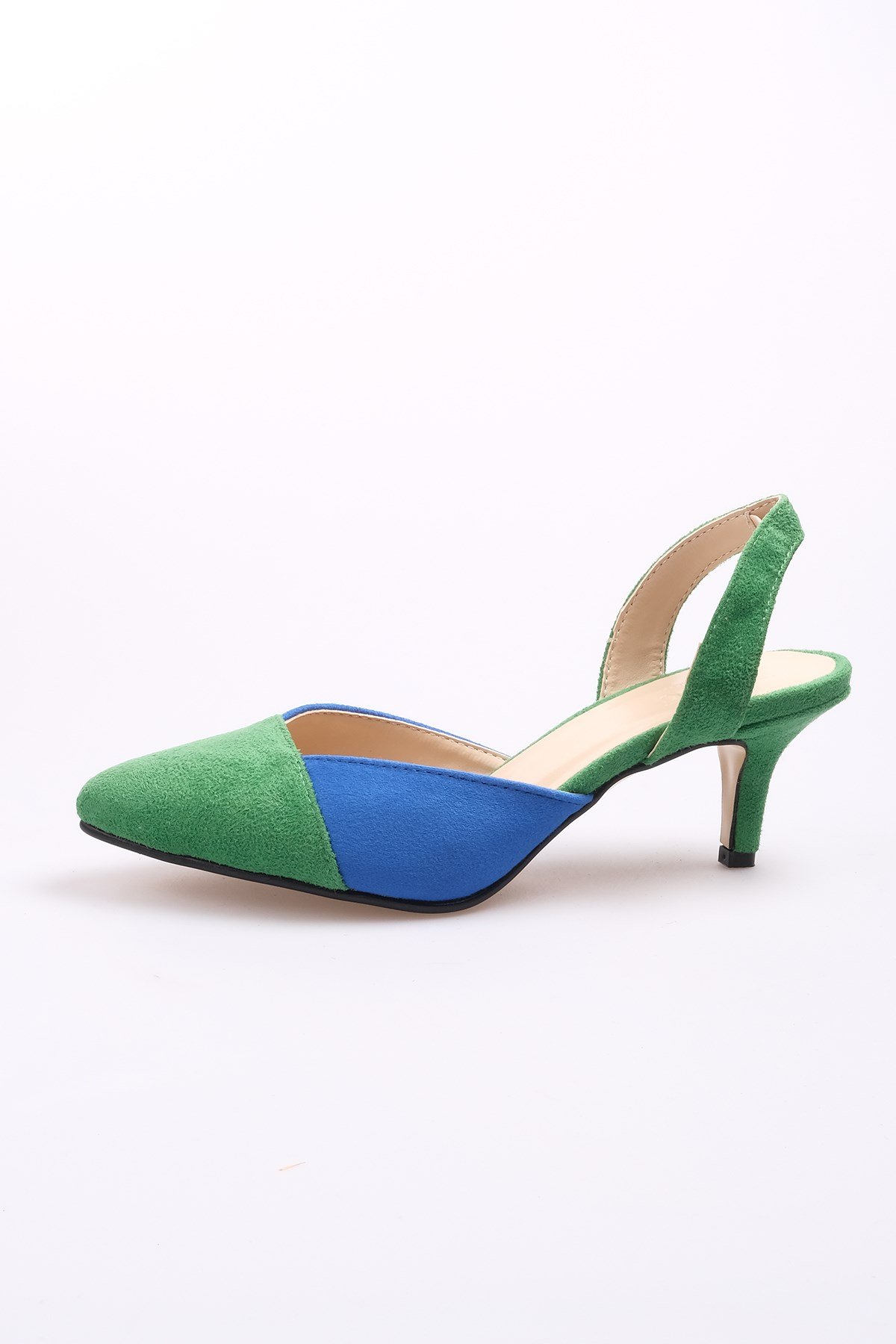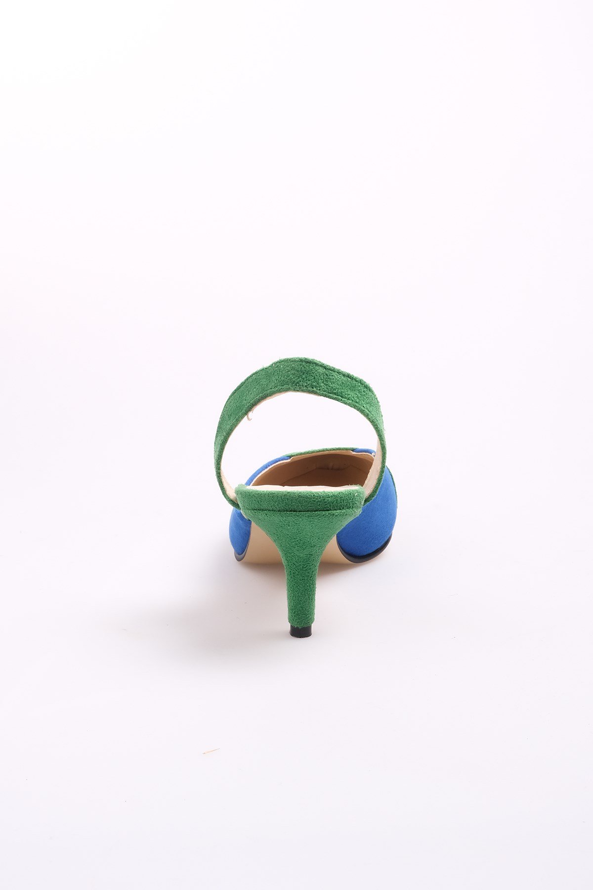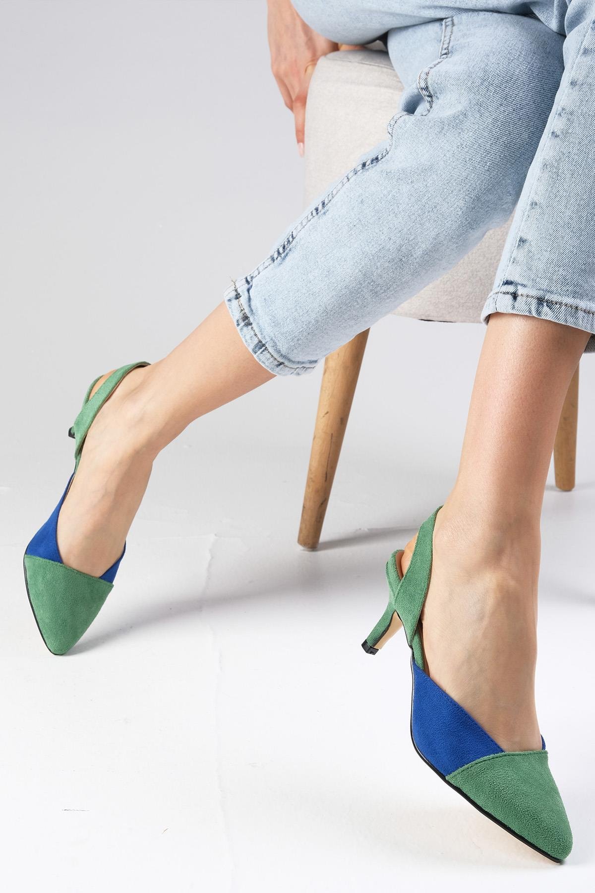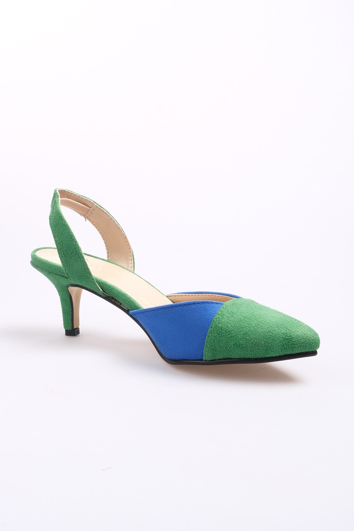 • Yeşil ve saks mavi renk kombinasyonlu kısa topuklu ayakkabı.