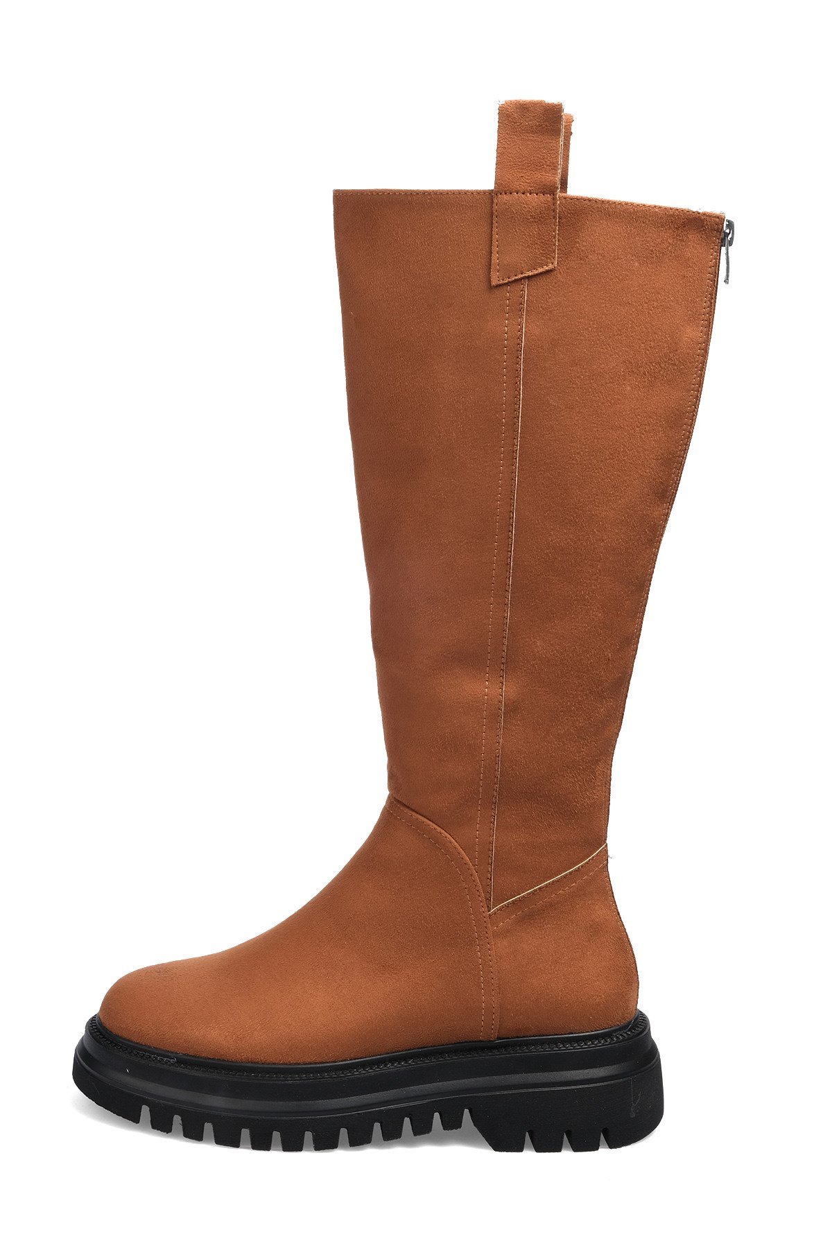 • Taba renk, arkadan fermuarlı, ince suni kürk astarlı, kalın tabanlı postal çizme.