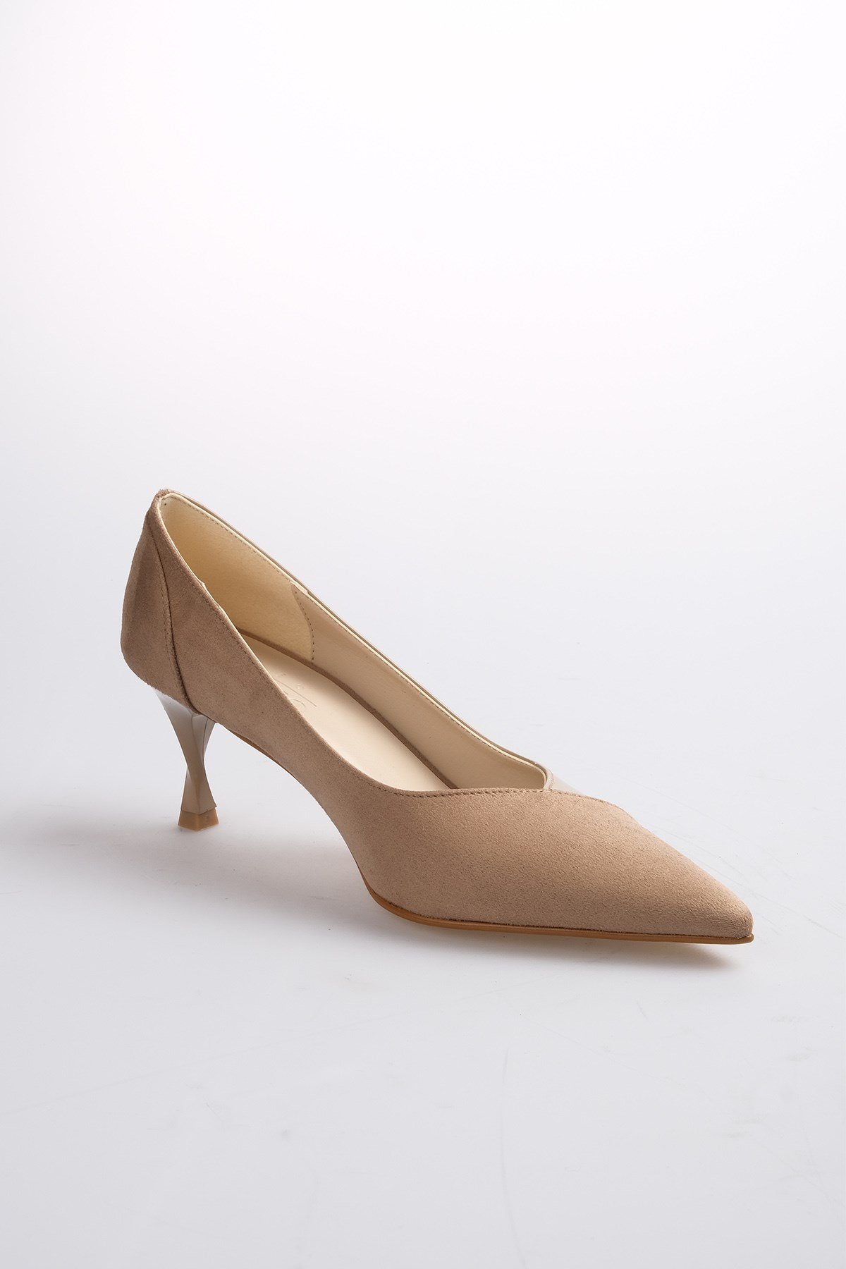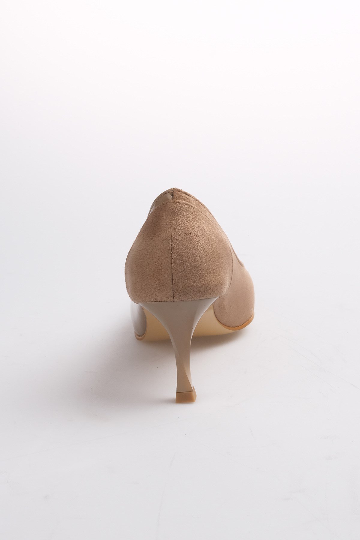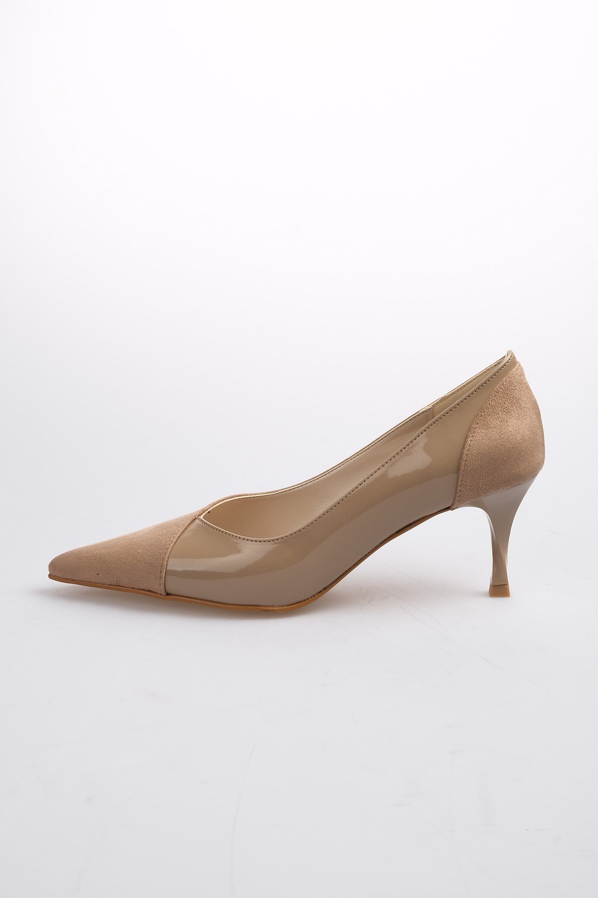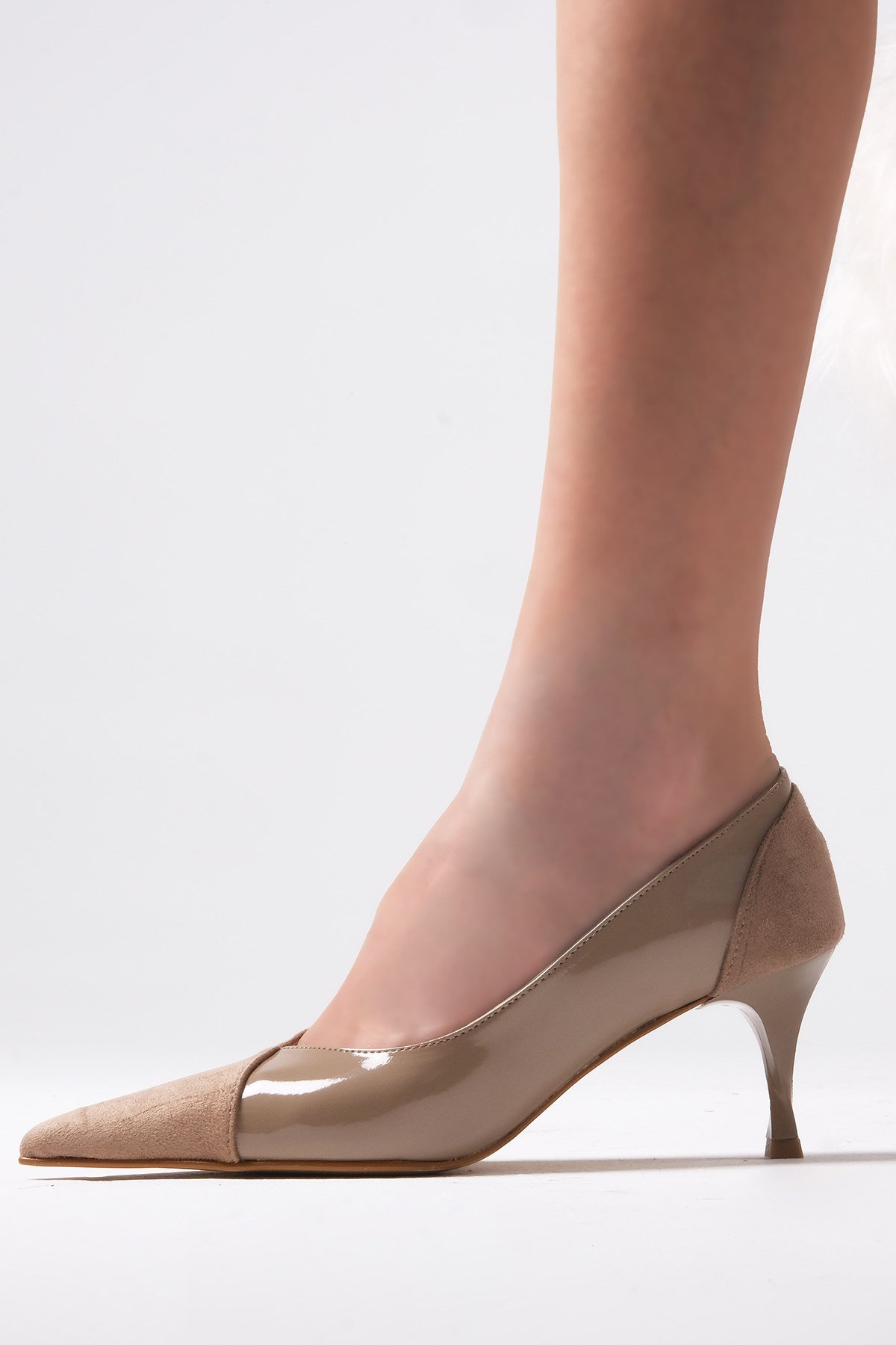 • Vizon renk süet ve rugan kombinasyonlu, burgu ökçeli topuklu ayakkabı