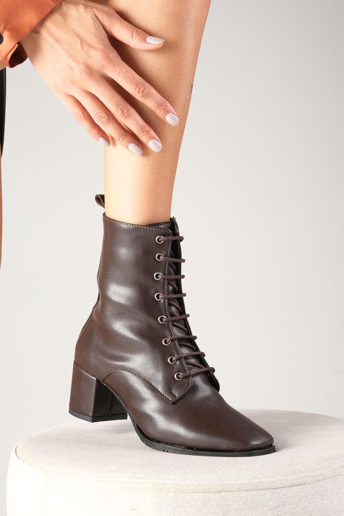 • Kahverengi, Küt Burun Yandan Fermuarlı ve Bağcıklı, İnce Suni Kürk Astarlı, Kadın Topuklu Çizme