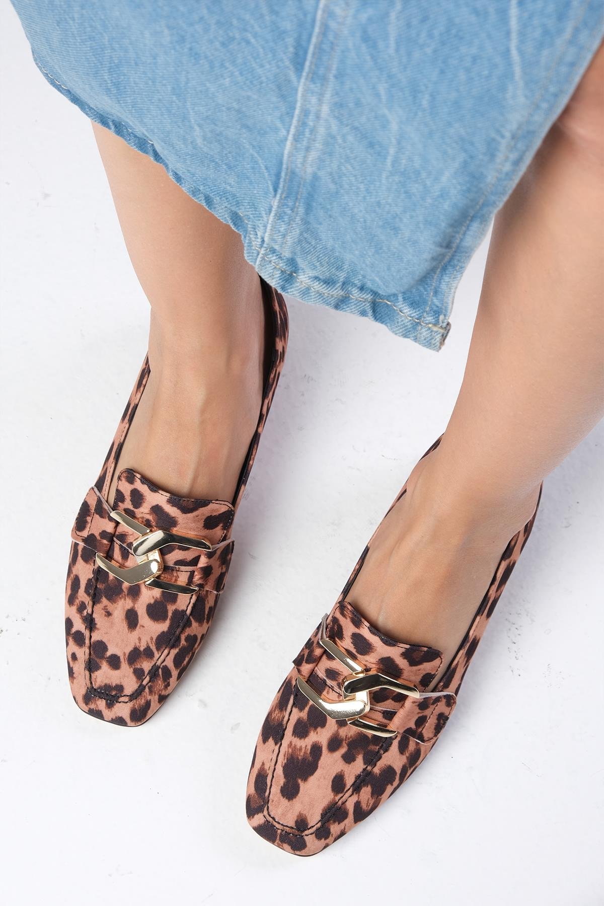 • Leopar desenli küt burunlu, toka aksesuarlı kısa topuklu kumaş ayakkabı.