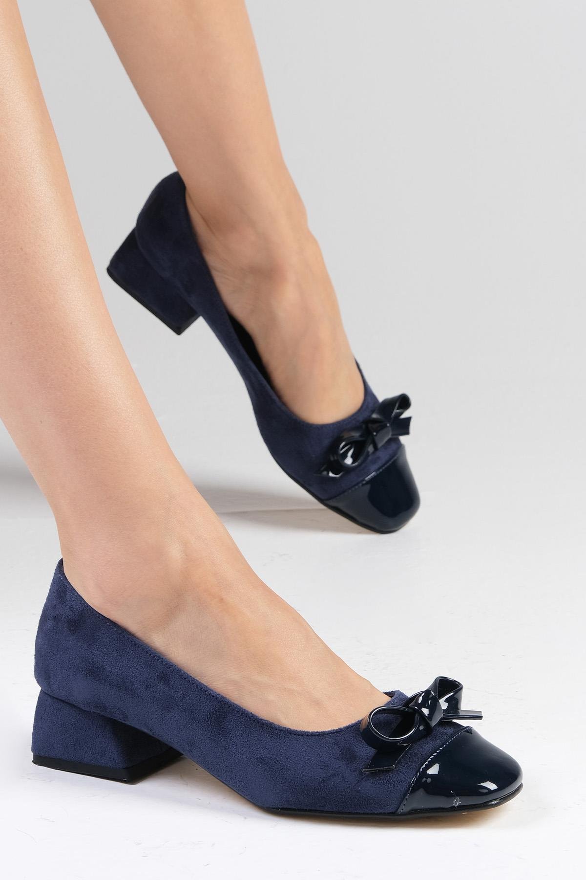 • Lacivert renk, rugan/süet kombinasyonlu, fiyonk aksesuarlı kısa topuklu ayakkabı.