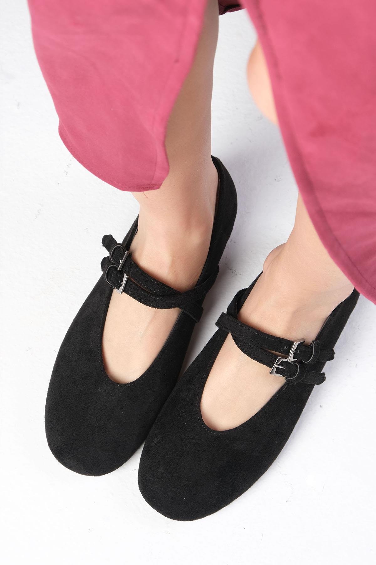 • Siyah Renk, Süet, Atkılı Kadın Babet Ayakkabı