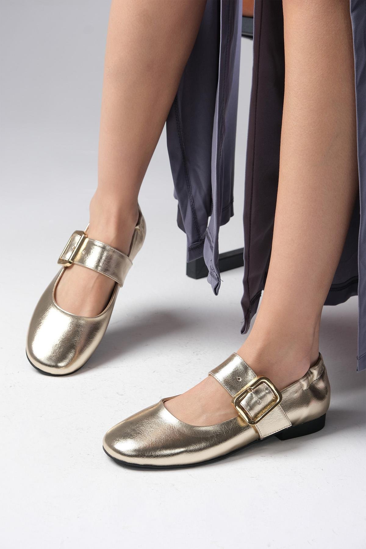 • Altın Renk, Kalın Kemerli, Kadın Babet Ayakkabı