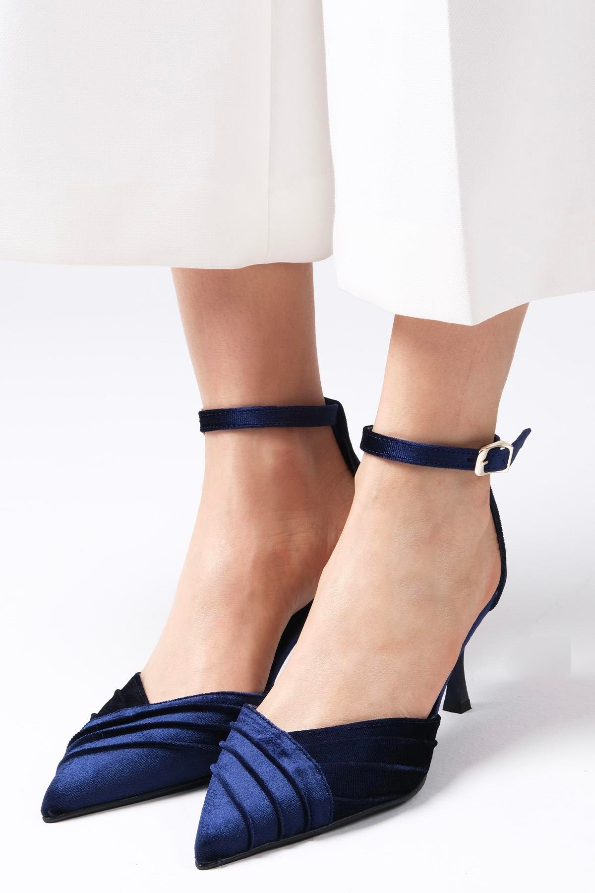 • Lacivert renk kadife kumaş yandan tokalı topuklu ayakkabı.