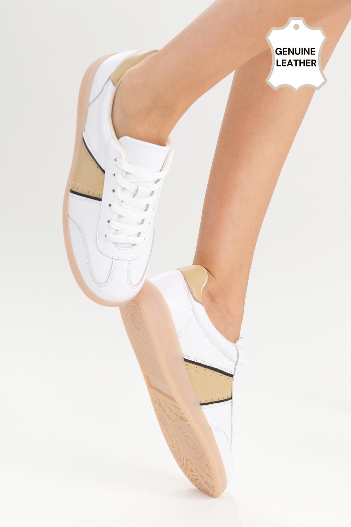 Şıklığı ve konforu bir arada sunan bu spor ayakkabı modeli, günlük kullanıma uygun zarif tasarımıyla dikkat çekiyor. Beyaz ana rengiyle ferah bir görünüm sunarken, yan kısmındaki bej ve siyah detaylar modern ve stil sahibi bir duruş kazandırıyor. Kaliteli deri malzeme kullanılarak üretilmiştir. İç tabanı yumuşak yapısıyla gün boyu konfor sağlarken, kaymaz dış tabanı güvenli bir yürüyüş deneyimi sunar. Bağcıklı tasarımı sayesinde ayağa tam oturur ve destek sağlar.