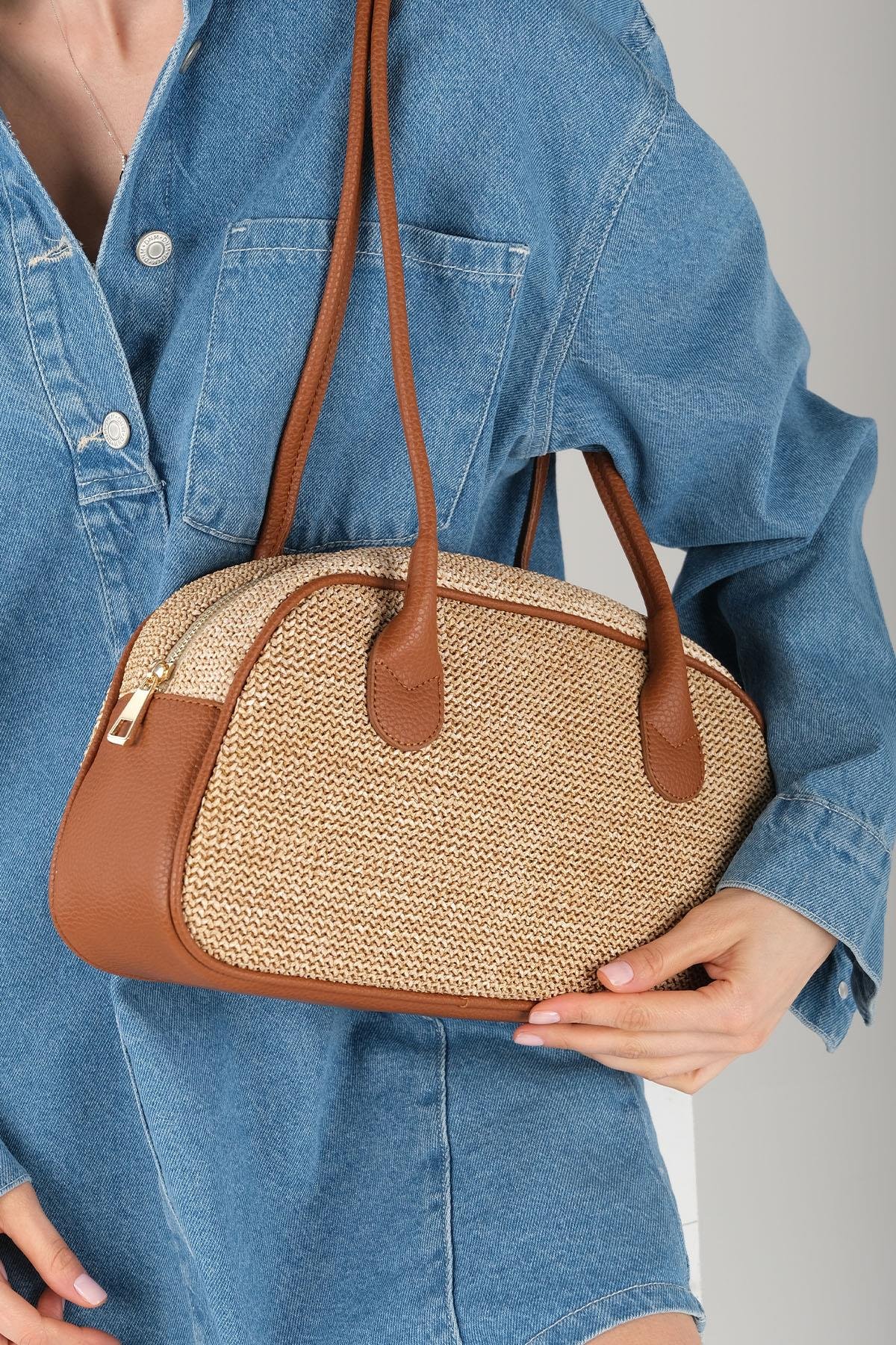 Malzeme: Hasır görünümlü örgü dış yüzey, suni deri detaylar