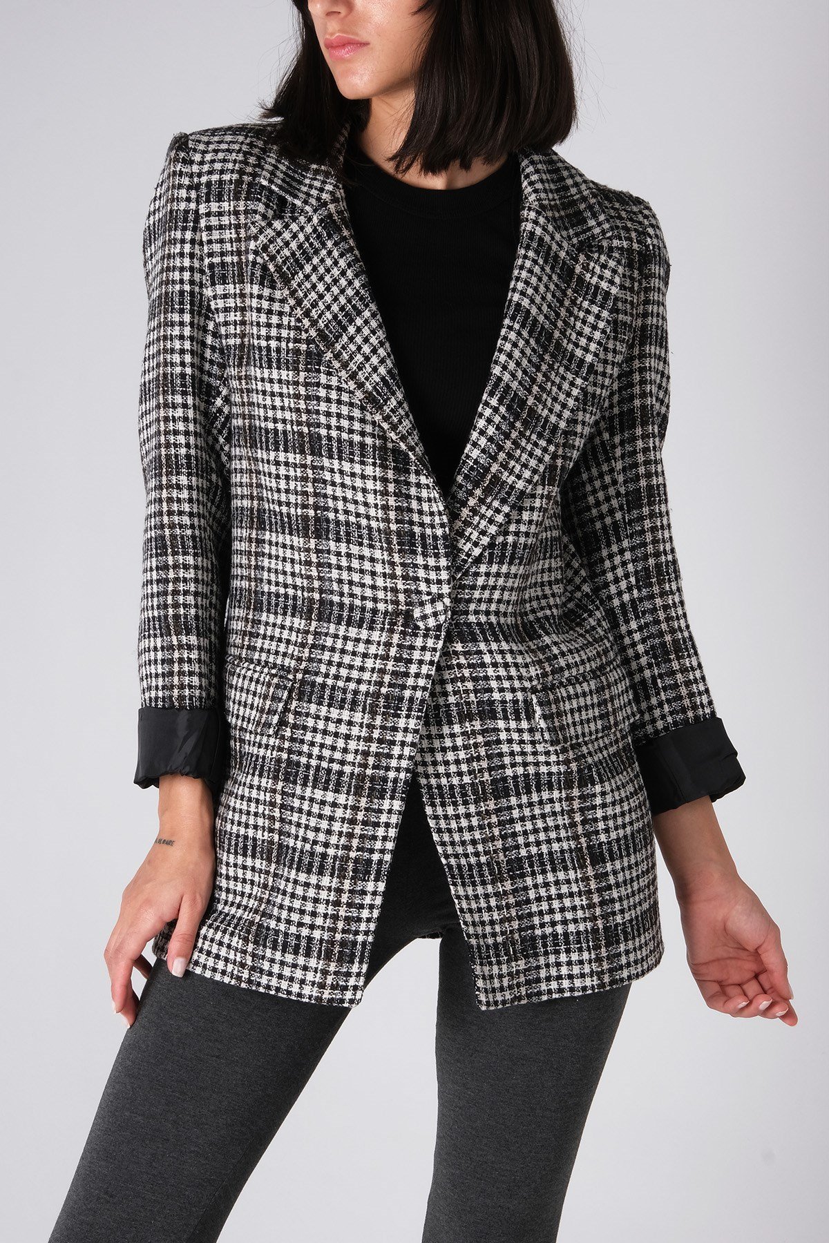 Siyah Ekose, Kareli,Vatkalı,Katlabilir Kol,Tek Düğmeli Cep Detaylı, Kadın Ceket