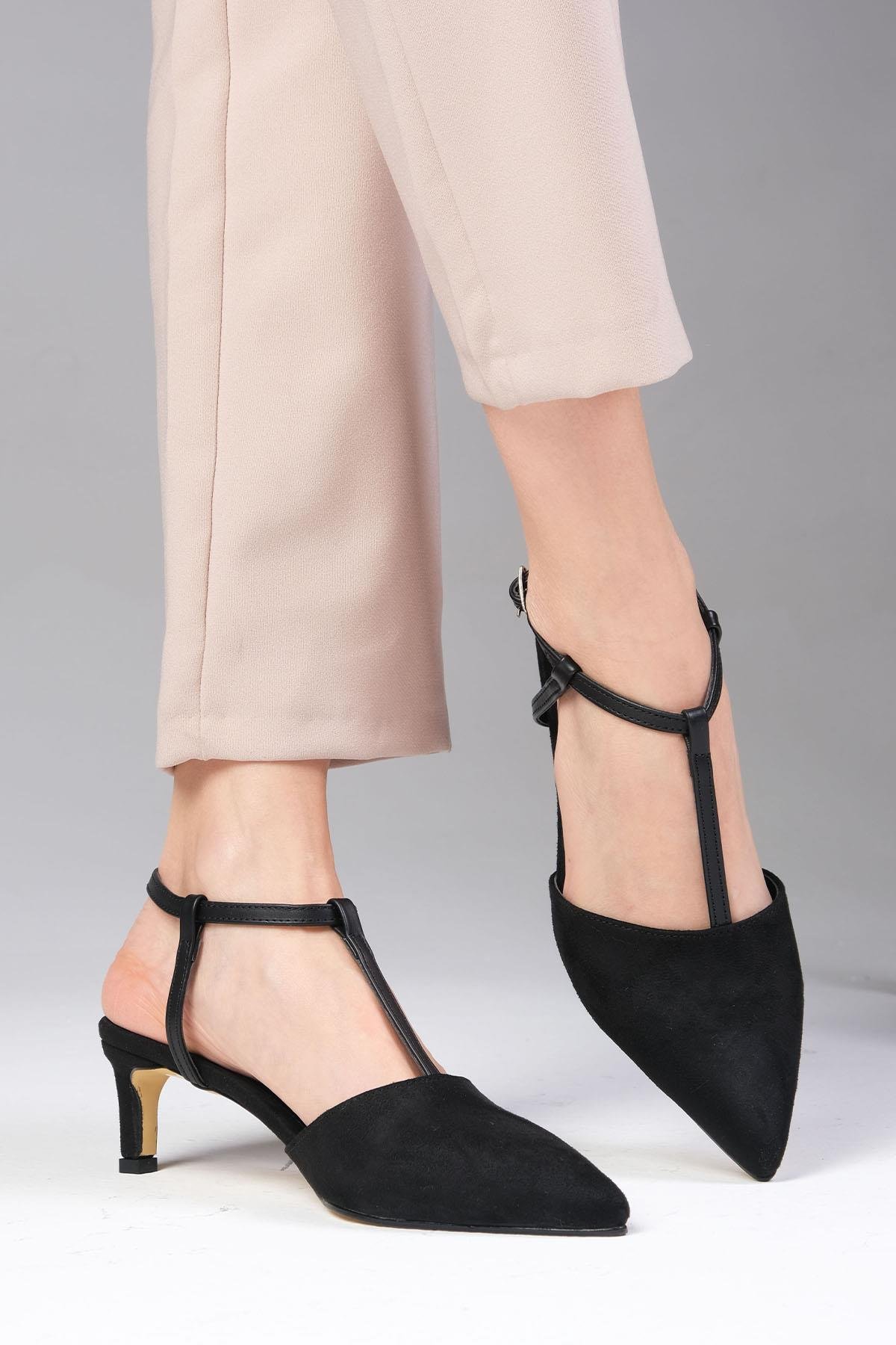 • Siyah Renk, Süet, Bantlı, Sivri Burunlu, Topuklu Ayakkabı