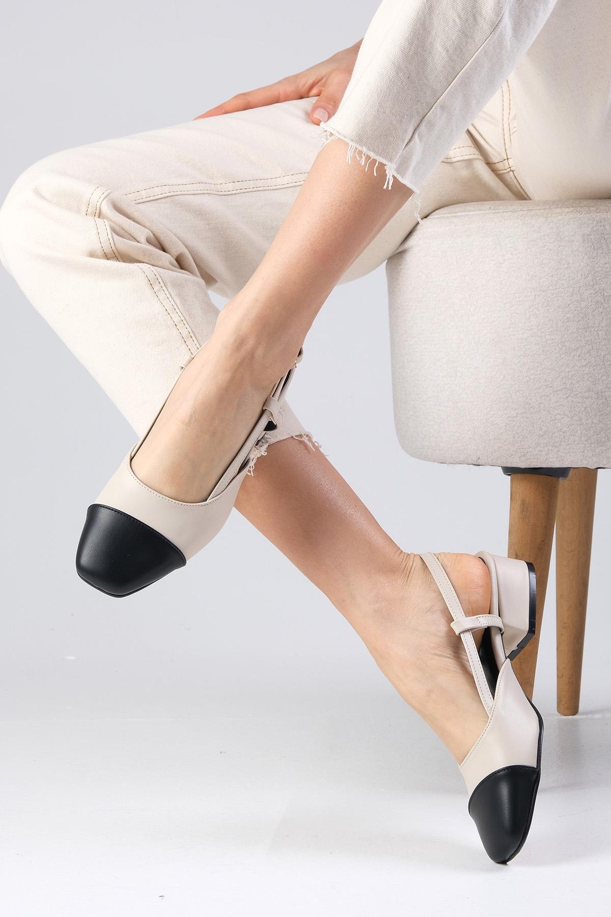 • Ten rengi ve siyah renk kombinasyonlu, arkası açık, yandan tokalı kısa topuklu ayakkabı