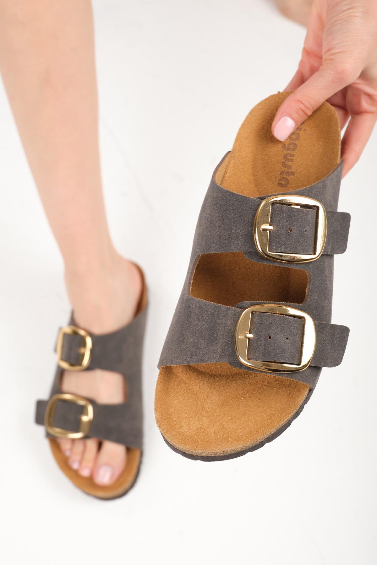 Antrasit, çift tokalı süet sandalet, yaz kombinlerinin vazgeçilmezi olacak.Antrasit tonunun zarafeti, gold tokaların şıklığı ve ortopedik tabanın rahatlığıyla stilini yansıtırken konfordan ödün vermeyeceksin.