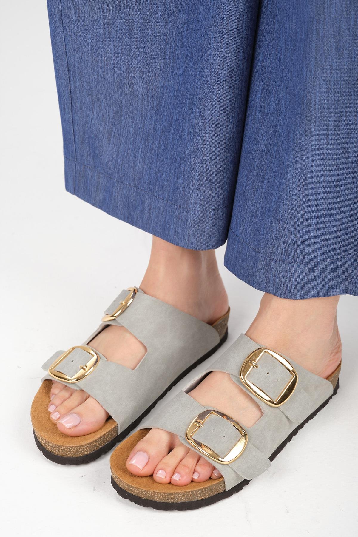 Gri renk, çift tokalı süet sandalet, yaz kombinlerinin vazgeçilmezi olacak. Gri tonun zarafeti, gold tokaların şıklığı ve ortopedik tabanın rahatlığıyla stilini yansıtırken konfordan ödün vermeyeceksin.