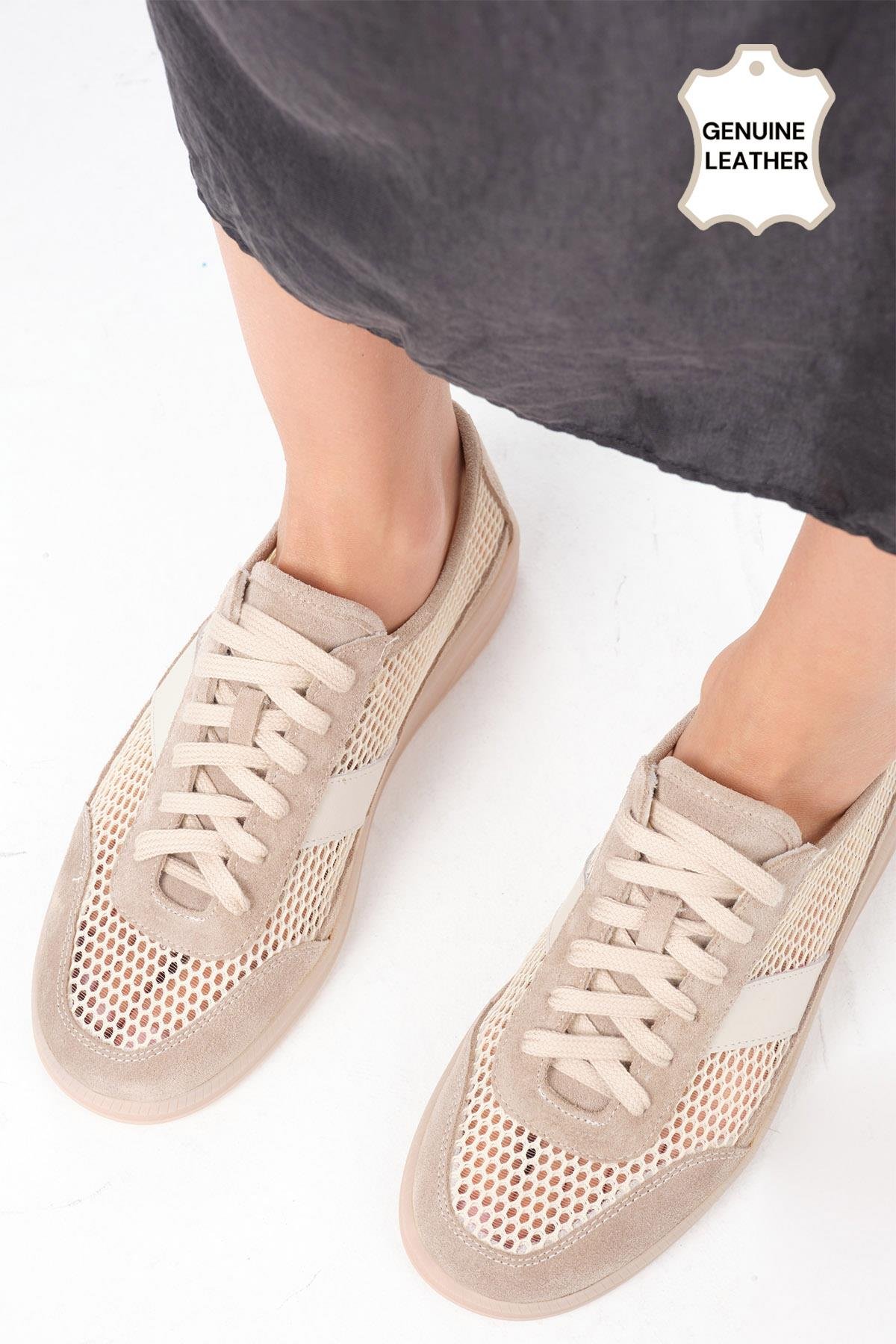 Modern tasarımı ve nefes alabilir yapısıyla öne çıkan bu bej spor ayakkabı, günlük kullanımda maksimum konfor sunar. File detayları sayesinde ayağınız gün boyu hava alır, yumuşak tabanı ise yürüyüşlerinizi destekler. Yan kısmındaki beyaz şerit detayı ise ayakkabıya sportif bir şıklık katıyor. Hem şehir hayatında hem de hafif aktivitelerde rahatlıkla kullanılabilir.