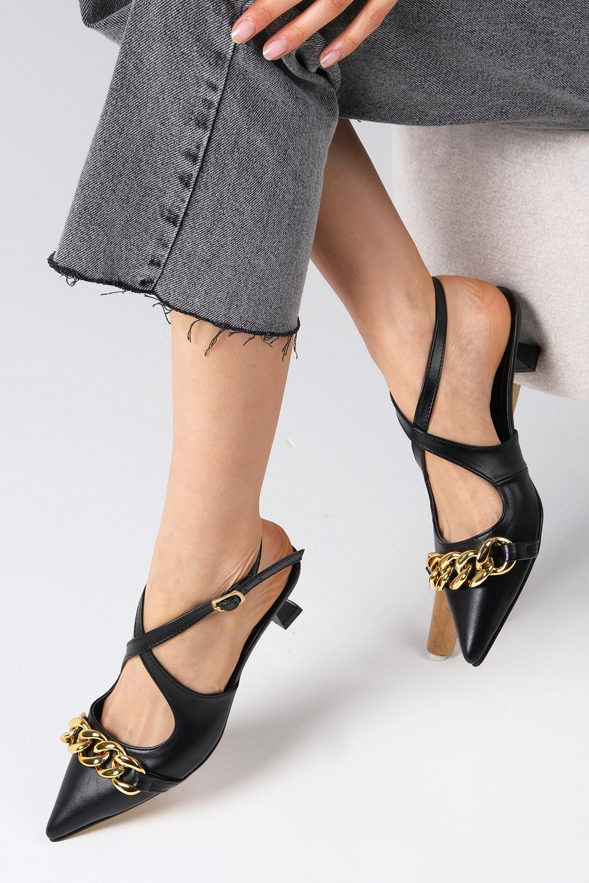 • Siyah renk, zincir aksesuarlı, mini topuklu ayakkabı