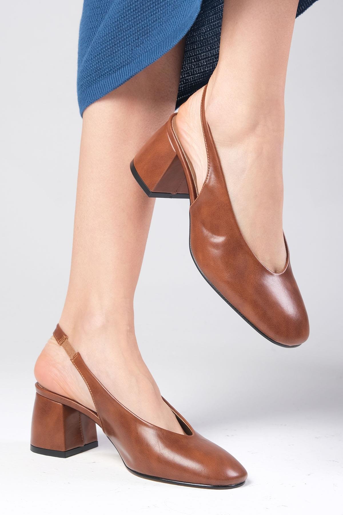 • Kahverengi, Arkası Açık, Kalın Topuklu Kadın  Ayakkabı