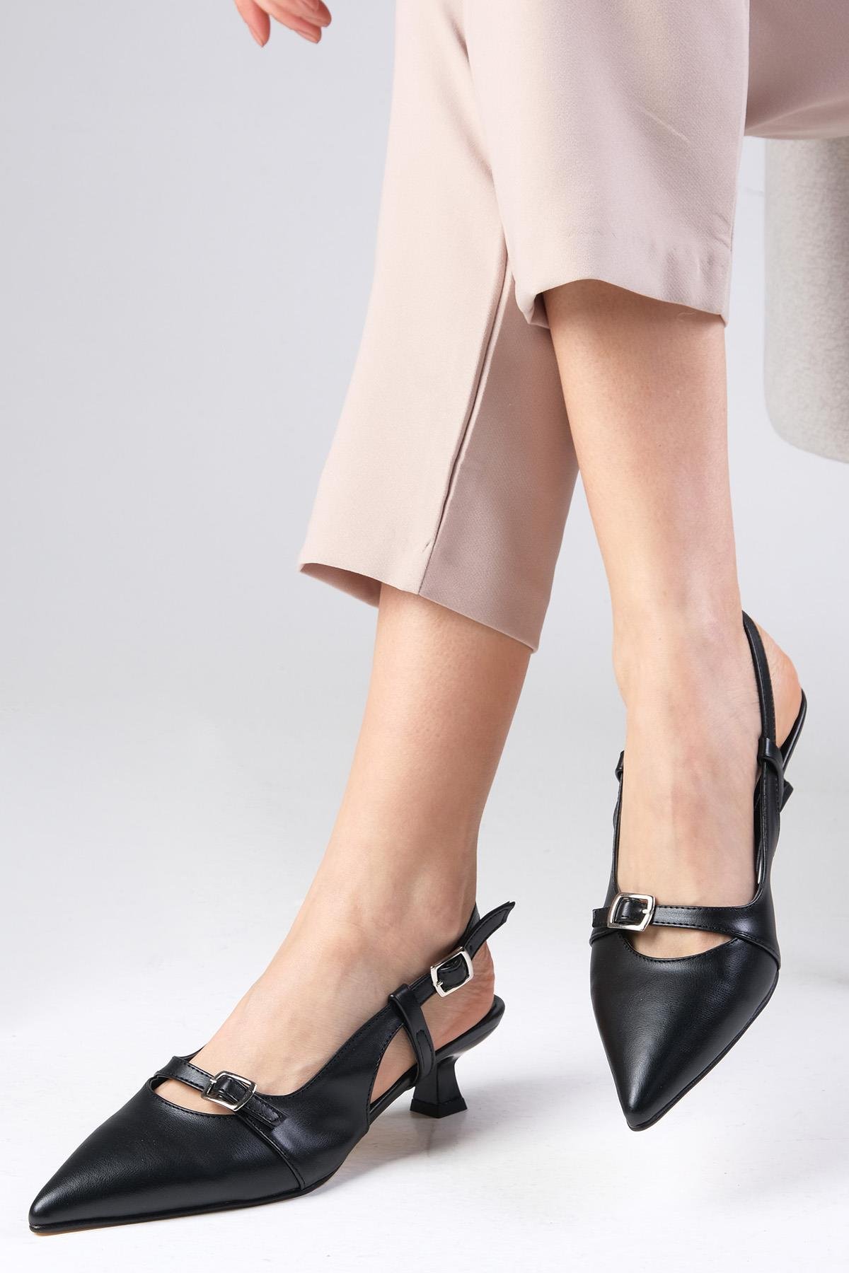 • Siyah renk, toka aksesuarlı, mini topuklu ayakkabı