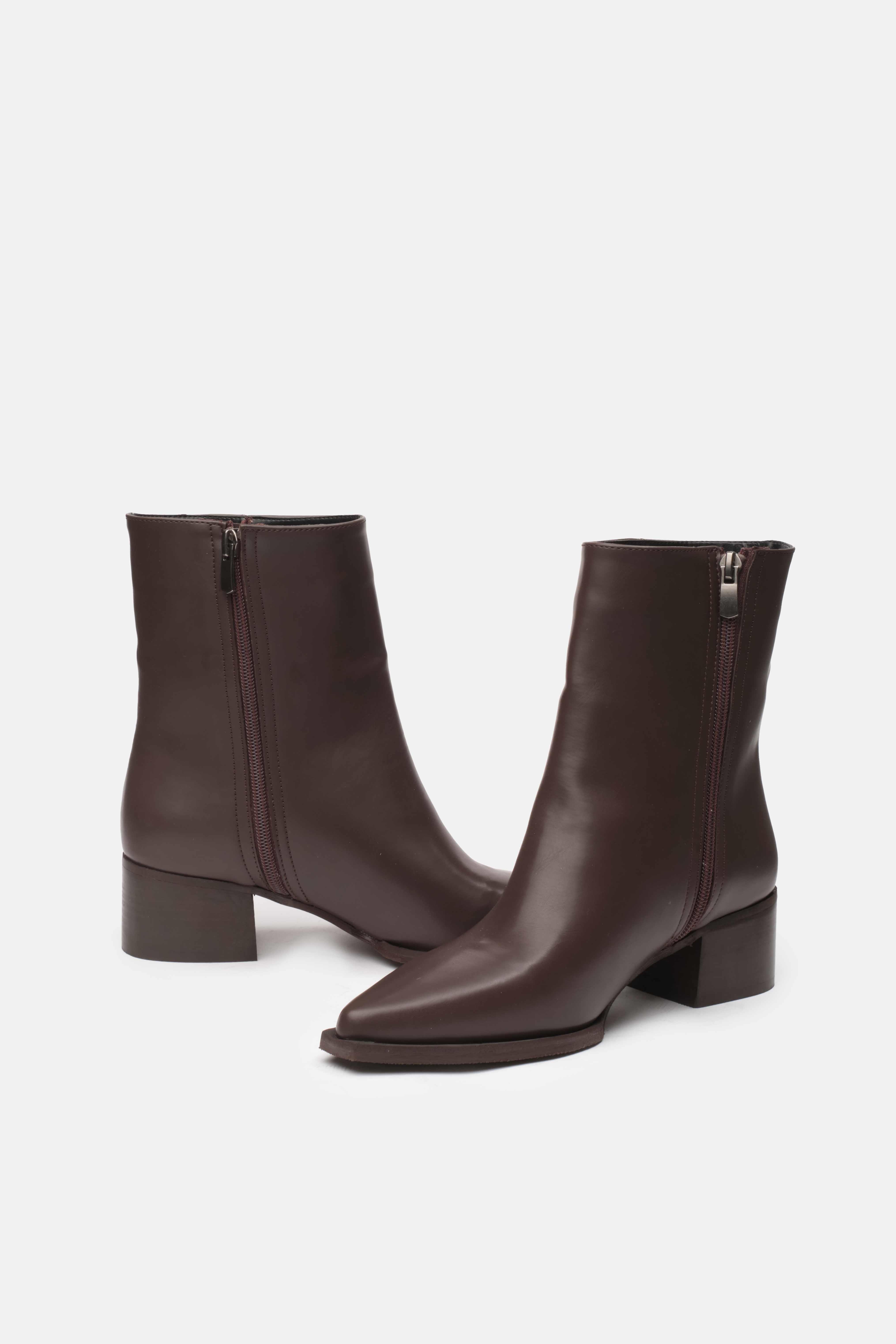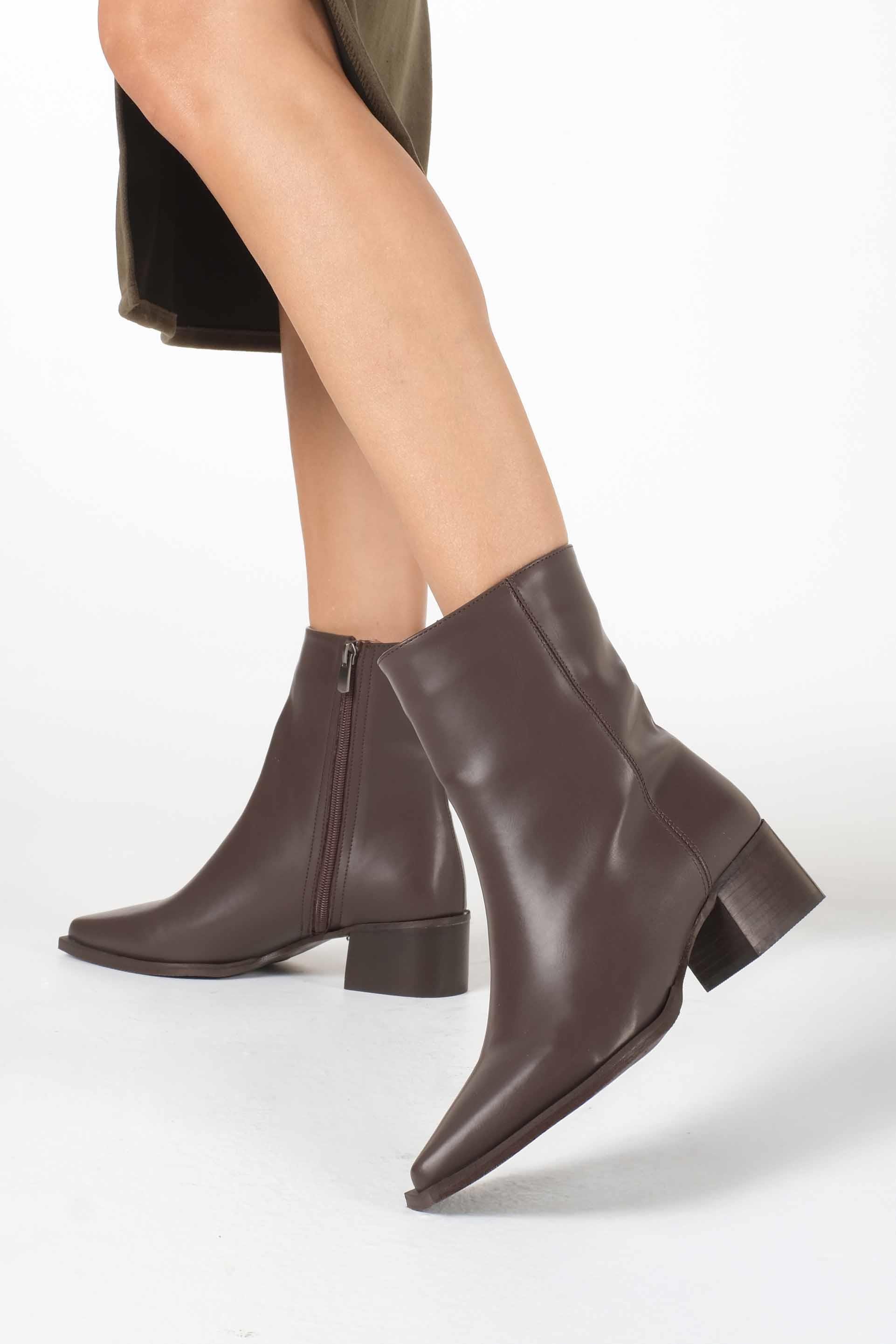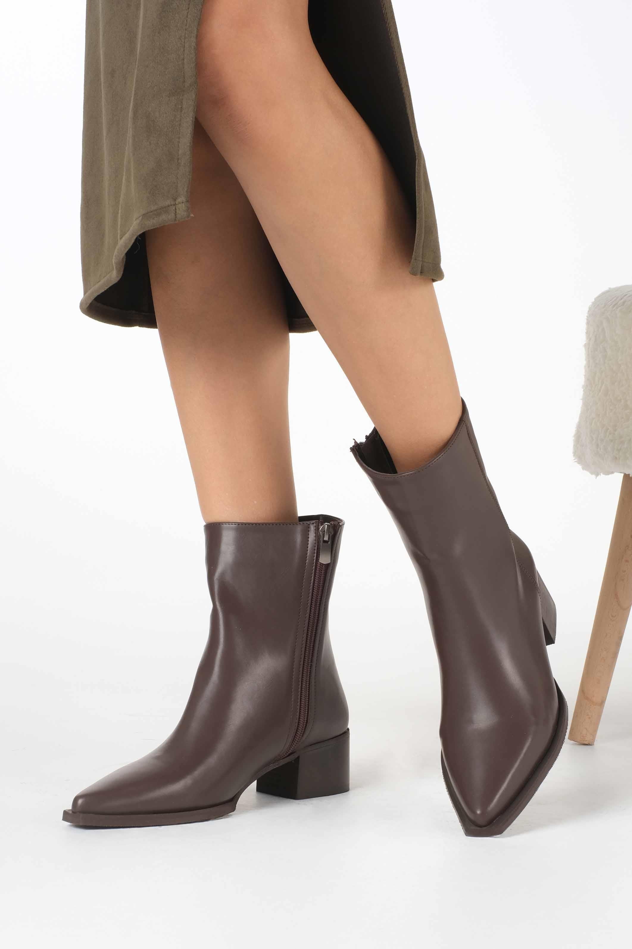 Zamansız şıklığın en güçlü tamamlayıcısı olan kahverengi sivri burun bot, hem günlük kombinlerinize hem de özel davetlerinize modern bir dokunuş katıyor. Şık tasarımıyla dikkat çeken model, zarif sivri burun formu sayesinde feminen bir görünüm sunarken, siyahın asaletiyle her tarz kıyafete kolayca uyum sağlıyor.