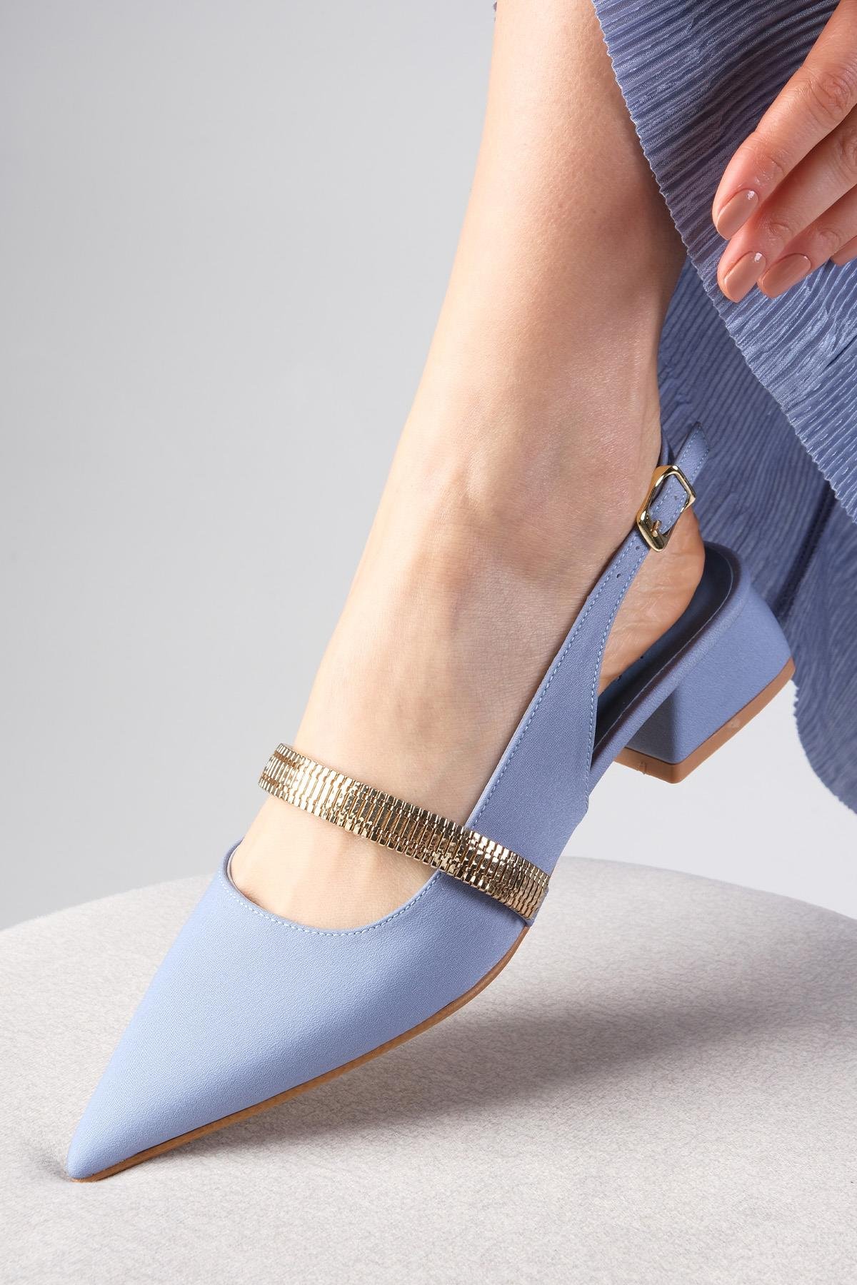 • Turuncu renk metal bant tokalı, arkası açık kısa topuklu ayakkabı.
