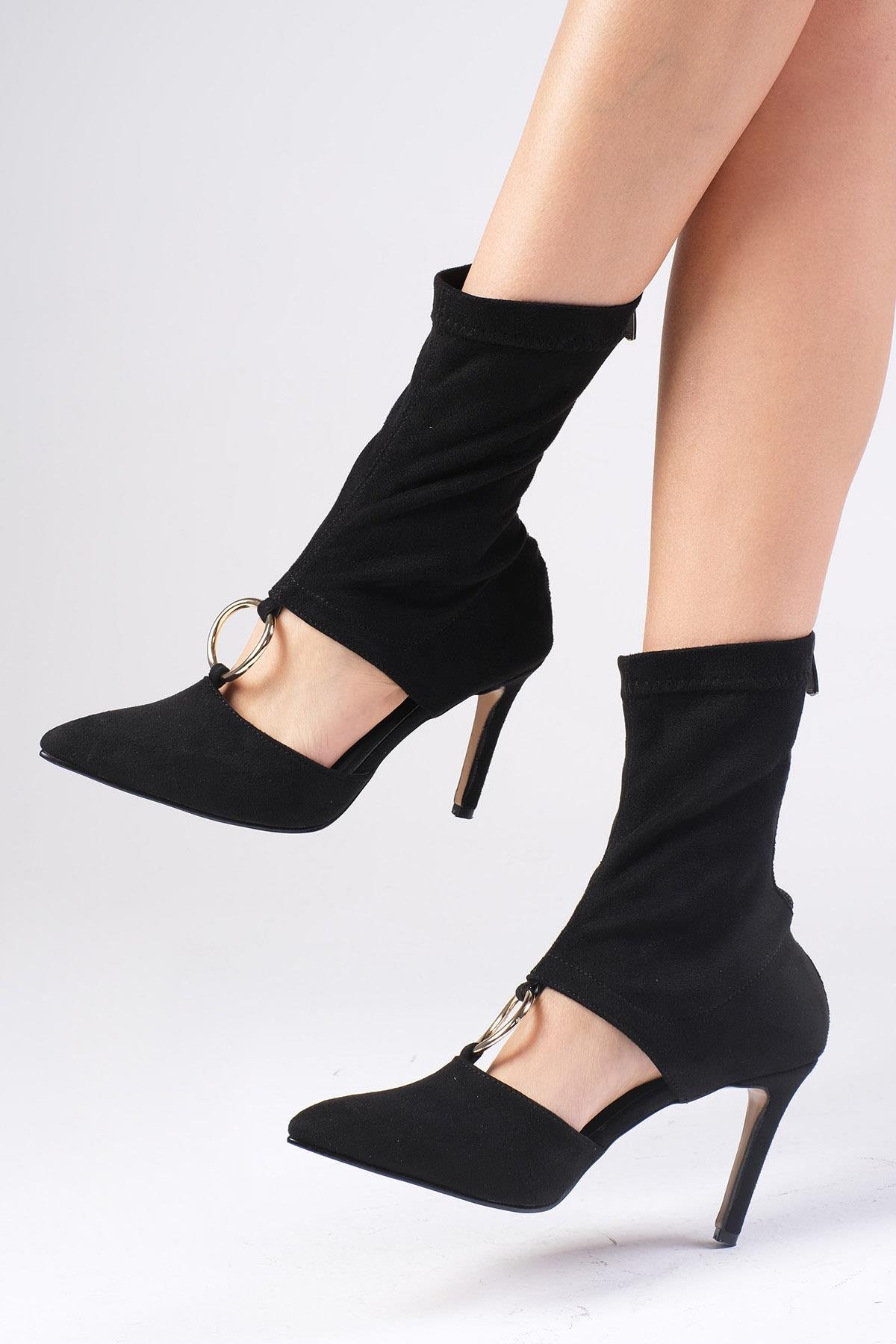 • Streç Süet Siyah Renk, Arkadan Fermuarlı Topuklu Bootie Ayakkabı.