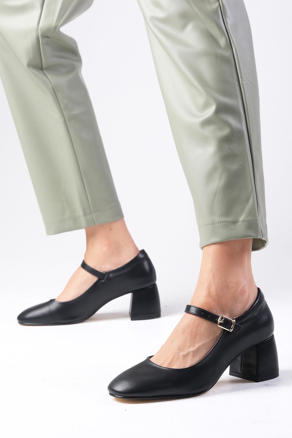 • Siyah renk, yuvarlak burunlu topuklu ayakkabı