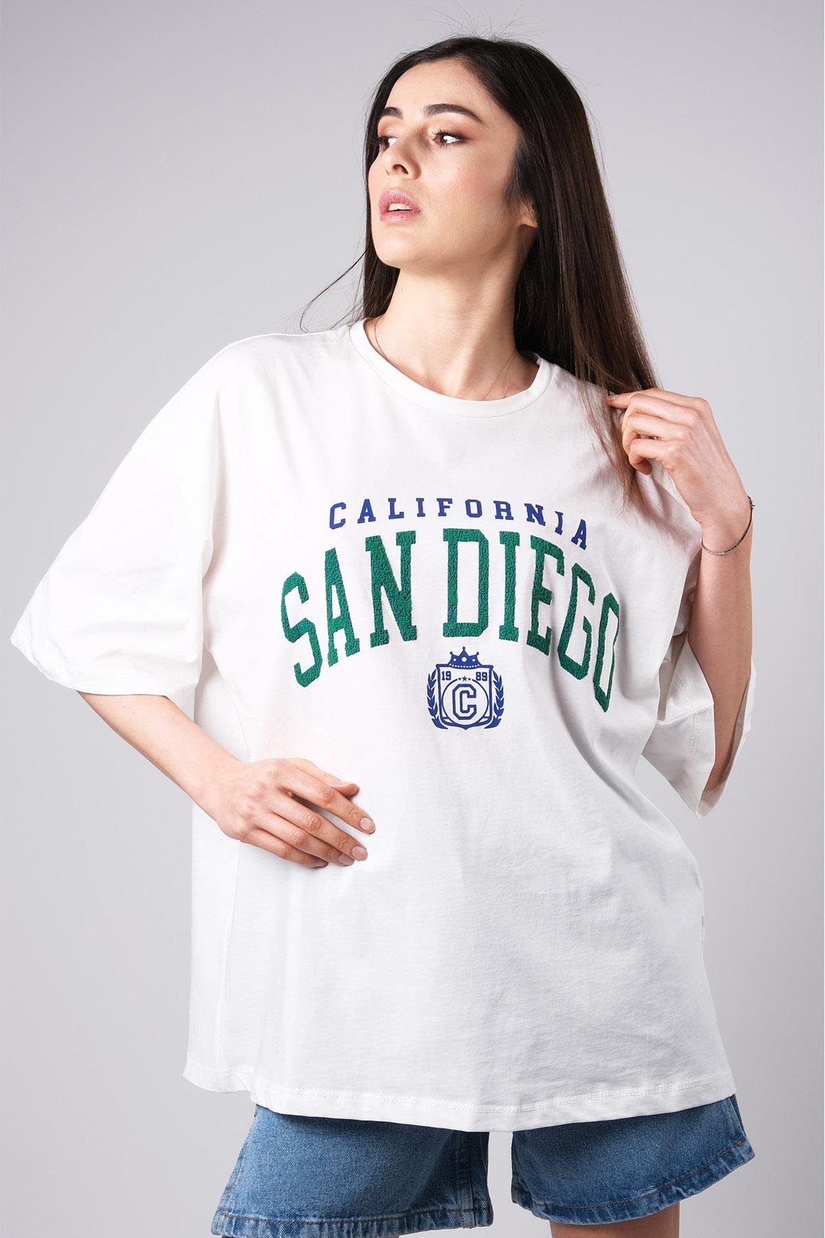 Ekru Renk, Oversize, Yeşil Baskılı Kadın Tişört