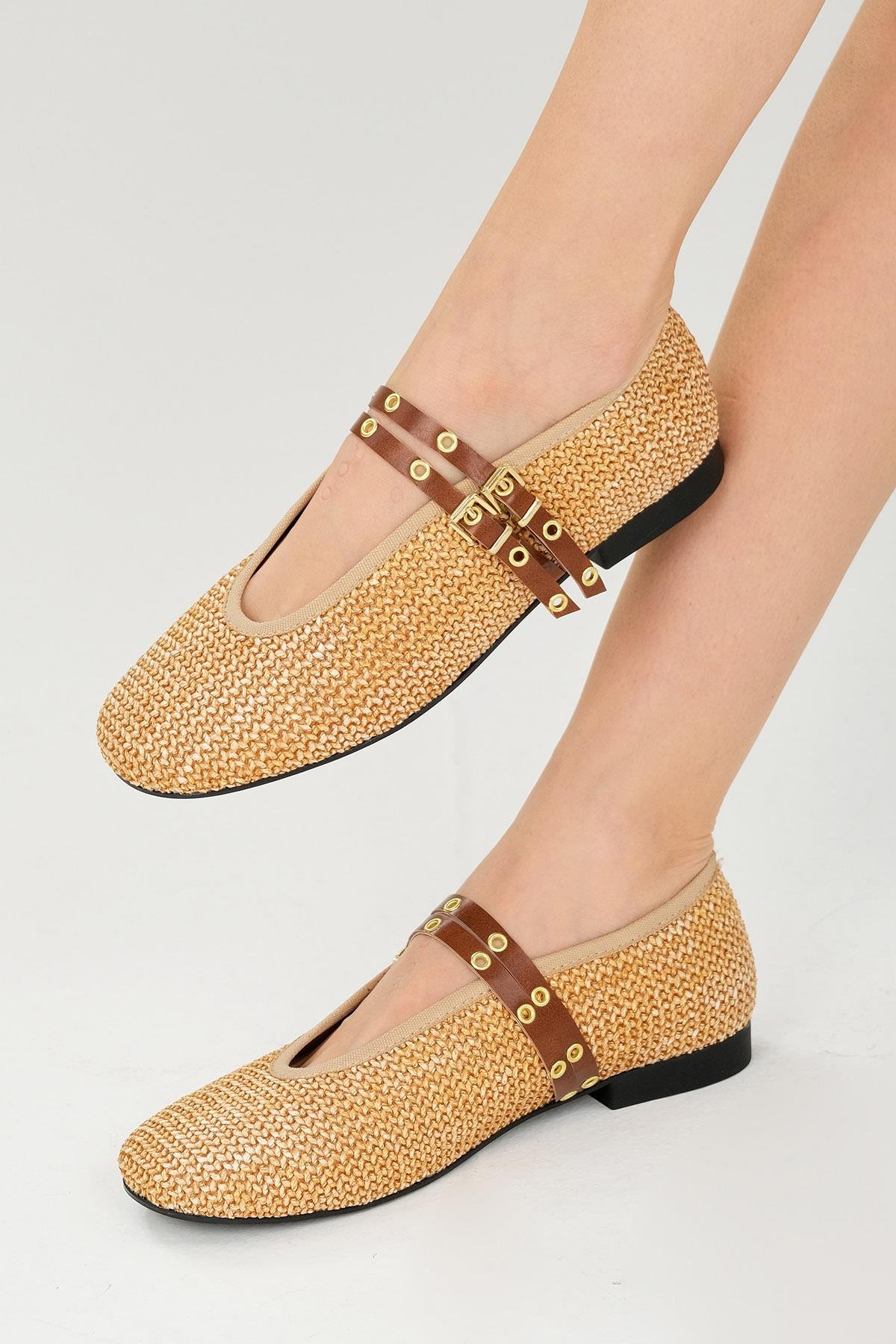 • Hasır Taba Renk Bantlı, Yuvarlak Burunlu Kadın Babet