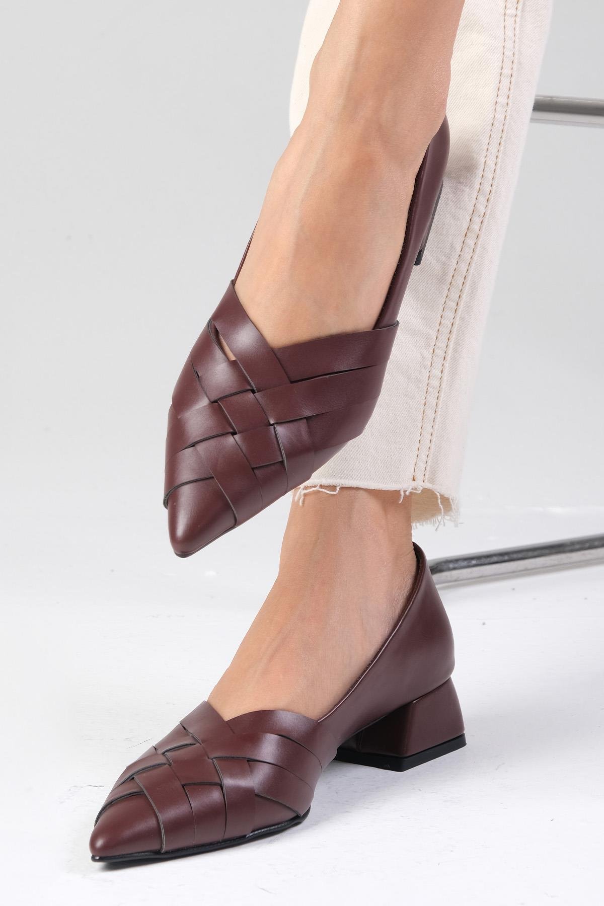 • Bordo renk, sivri burun kısa topuklu ayakkabı