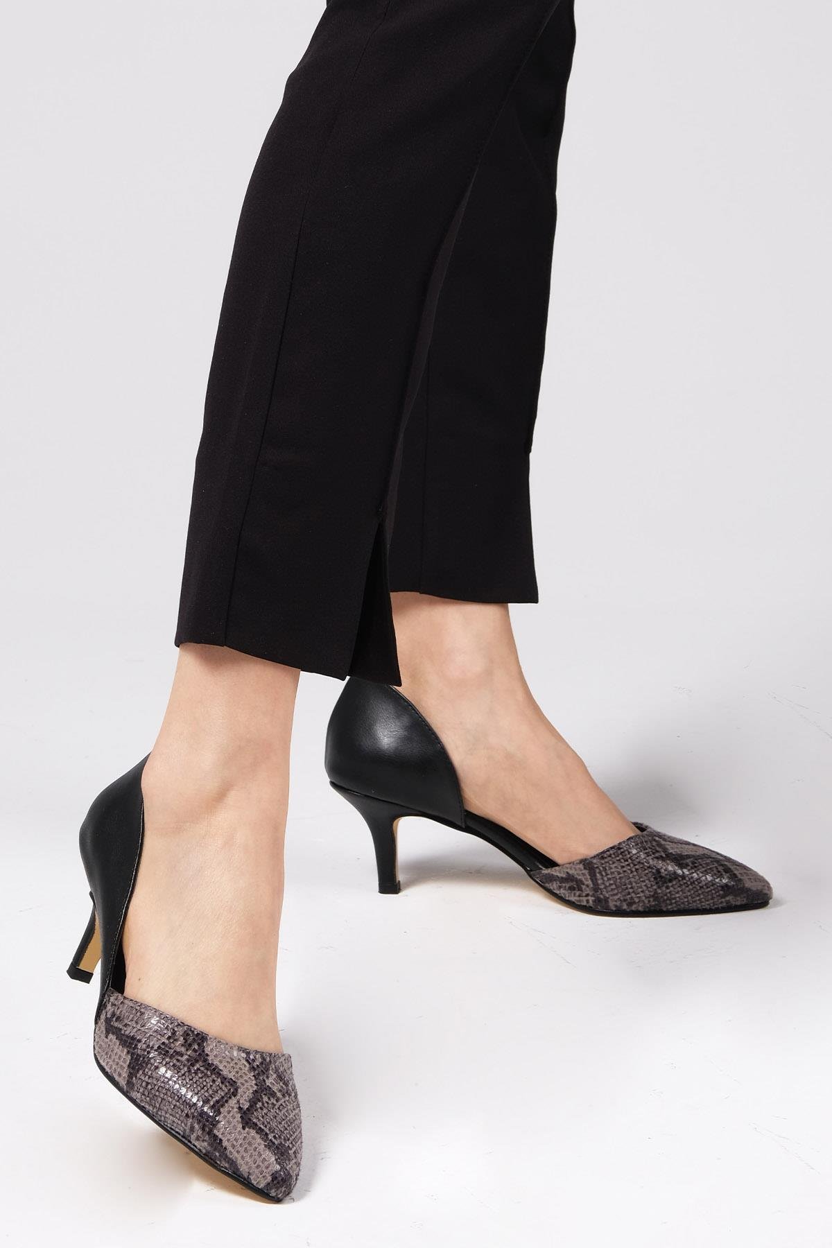 • Gri renk yılan derisi desenli yan kısmı açık kısa topuklu ayakkabı.