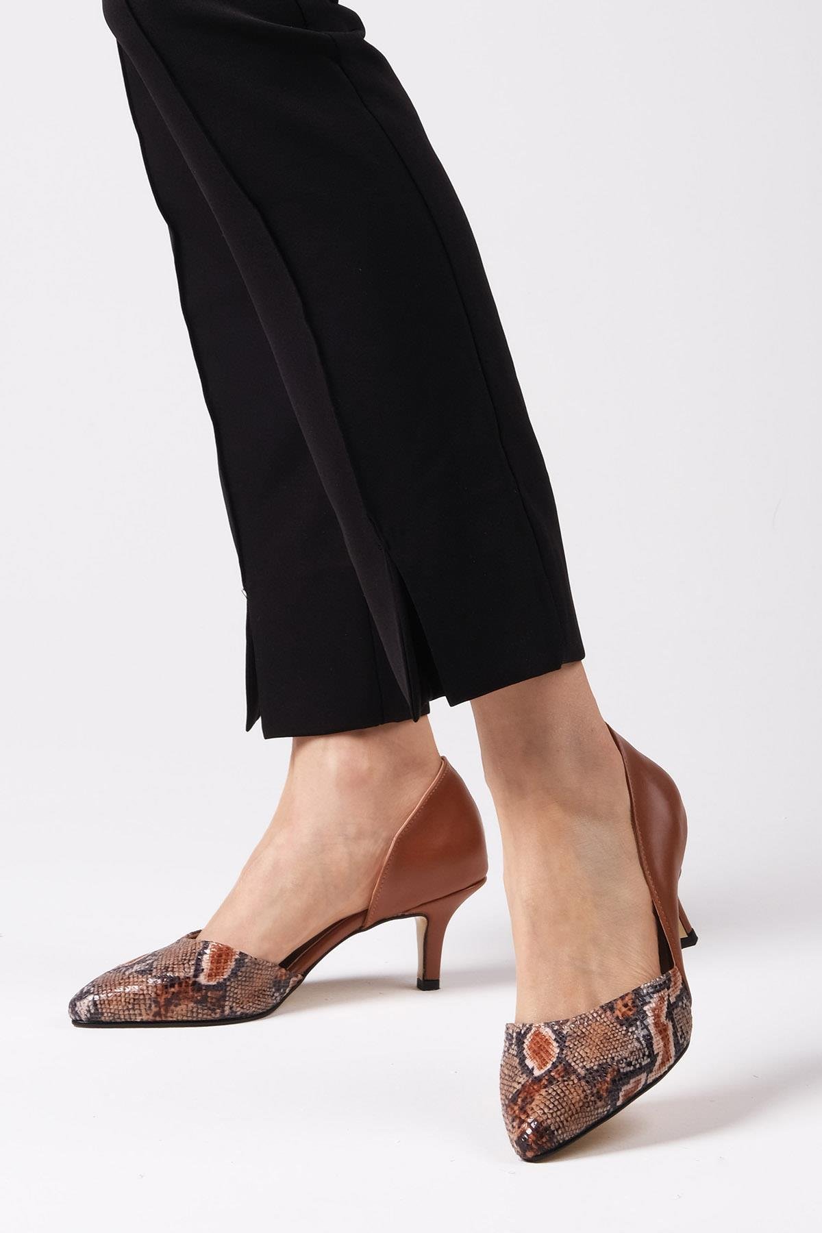 • Taba renk yılan derisi desenli yan kısmı açık kısa topuklu ayakkabı.