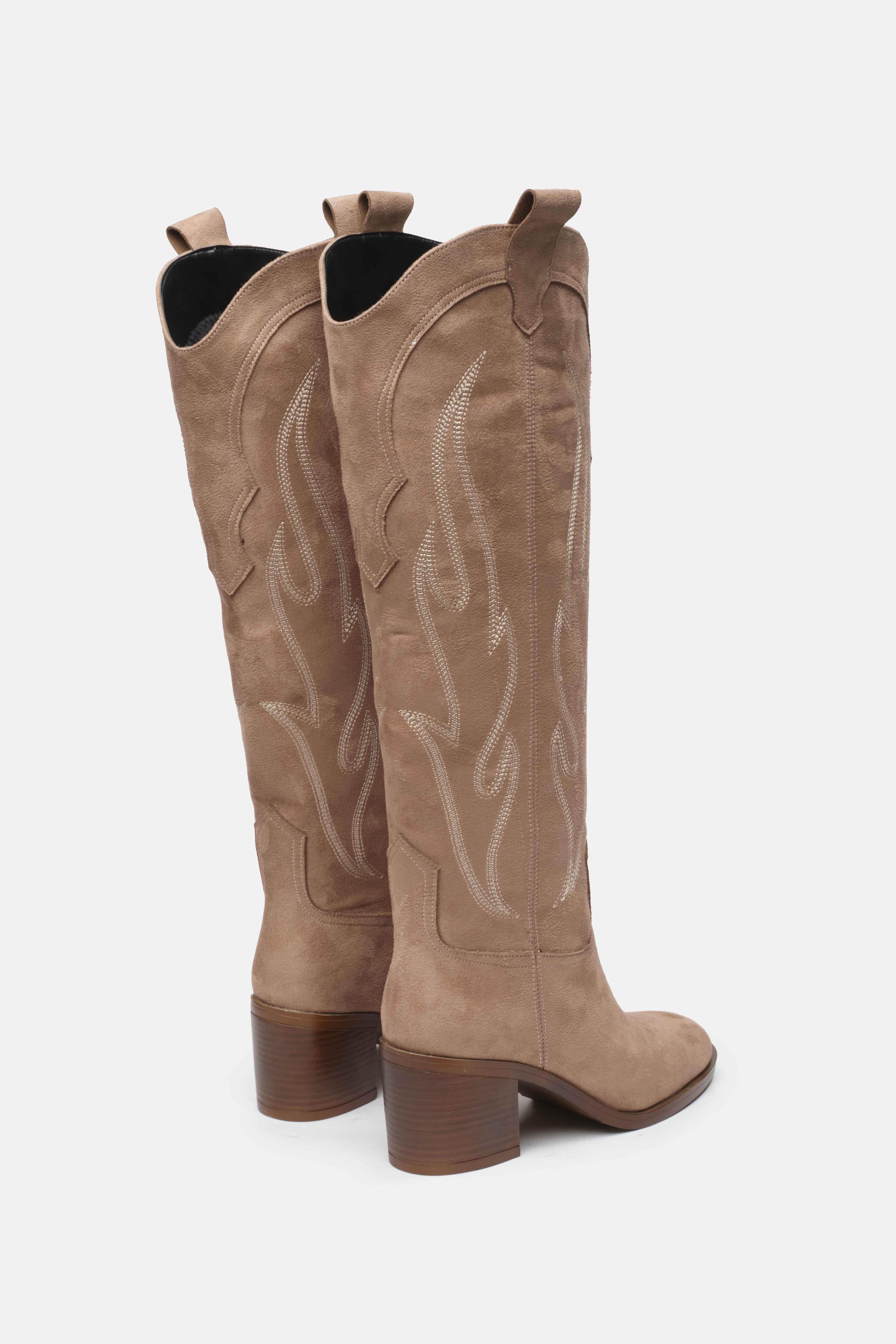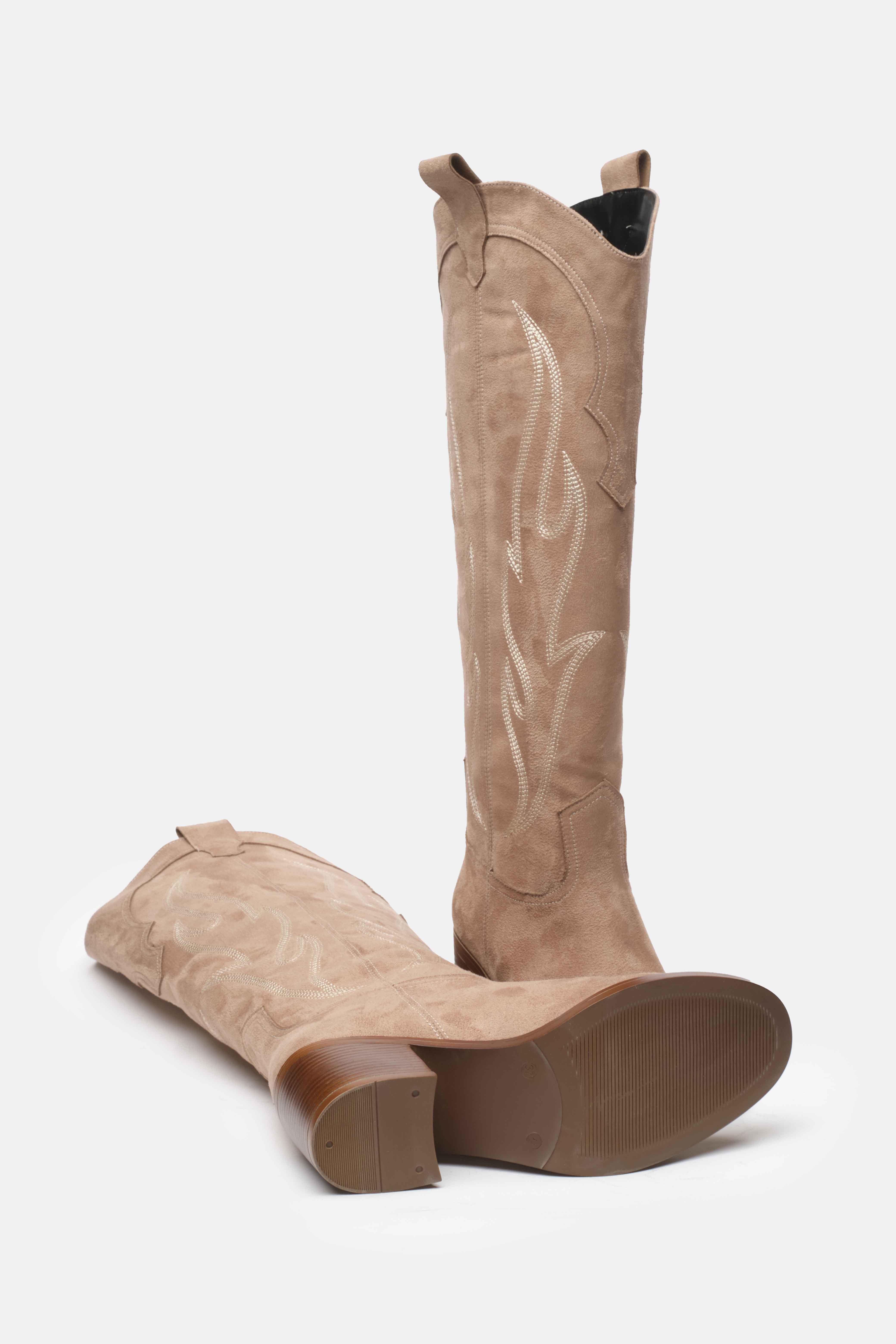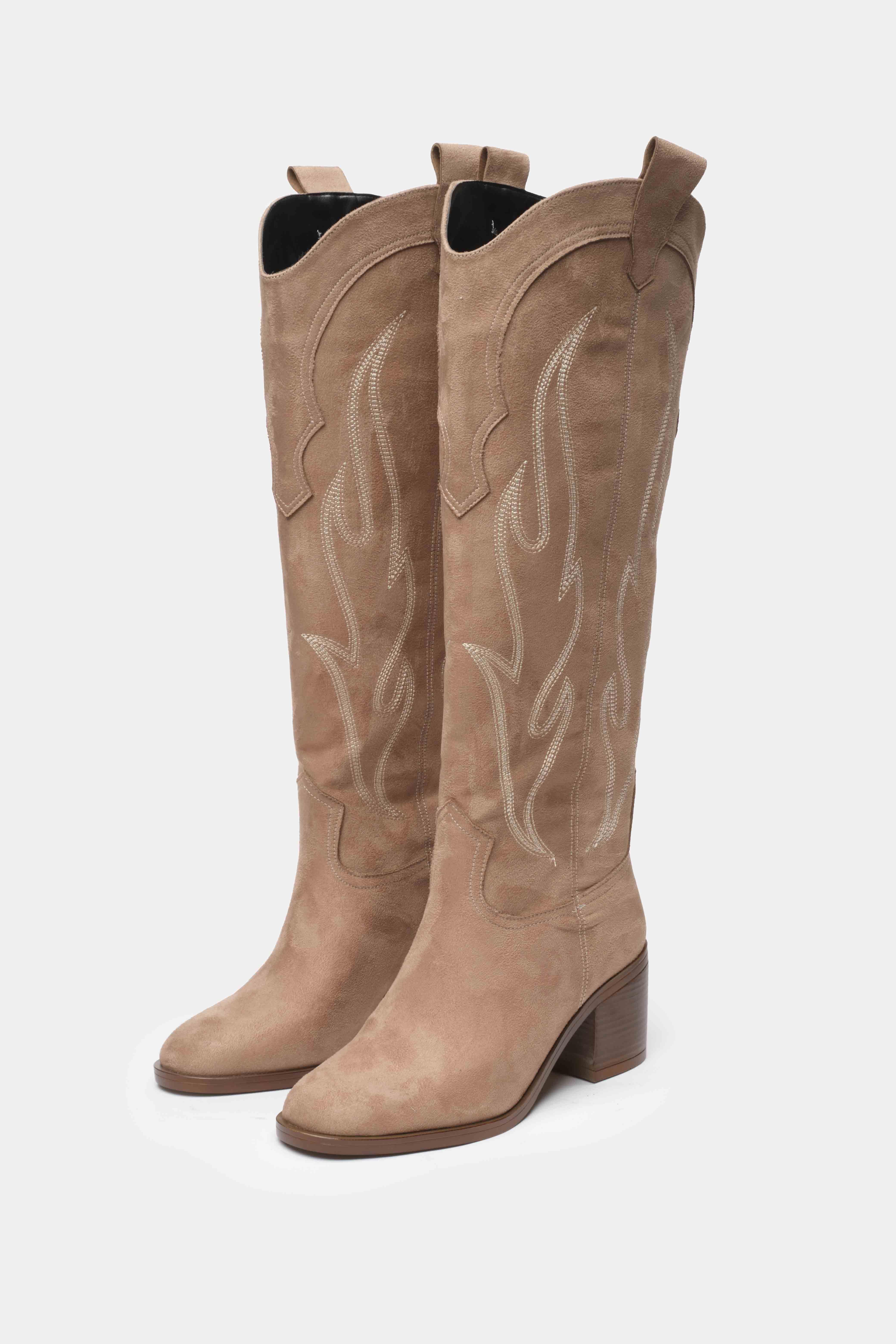 Western esintili bu kovboy çizmesi, süet görünümlü kaliteli malzemesi ve dikkat çekici dikiş detaylarıyla şıklığı konforla buluşturuyor. Orta topuk boyu sayesinde gün boyu rahat kullanım sunarken, diz altına kadar uzanan tasarımı stilinizi güçlü bir şekilde tamamlar. Jean, etek ve elbiselerle kolayca kombinlenebilen bu çizme, modern ve zamansız bir görünüm arayanlar için ideal.