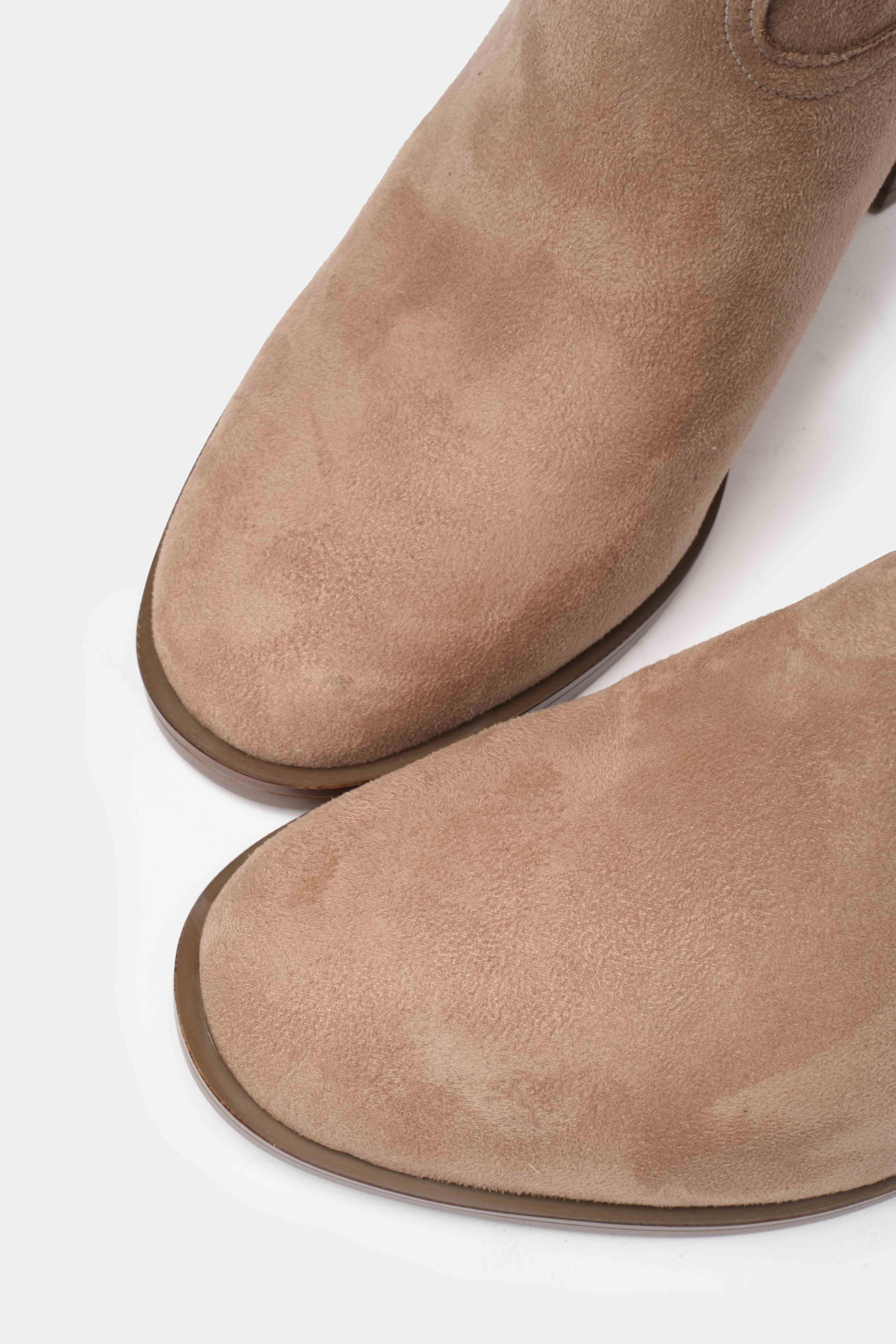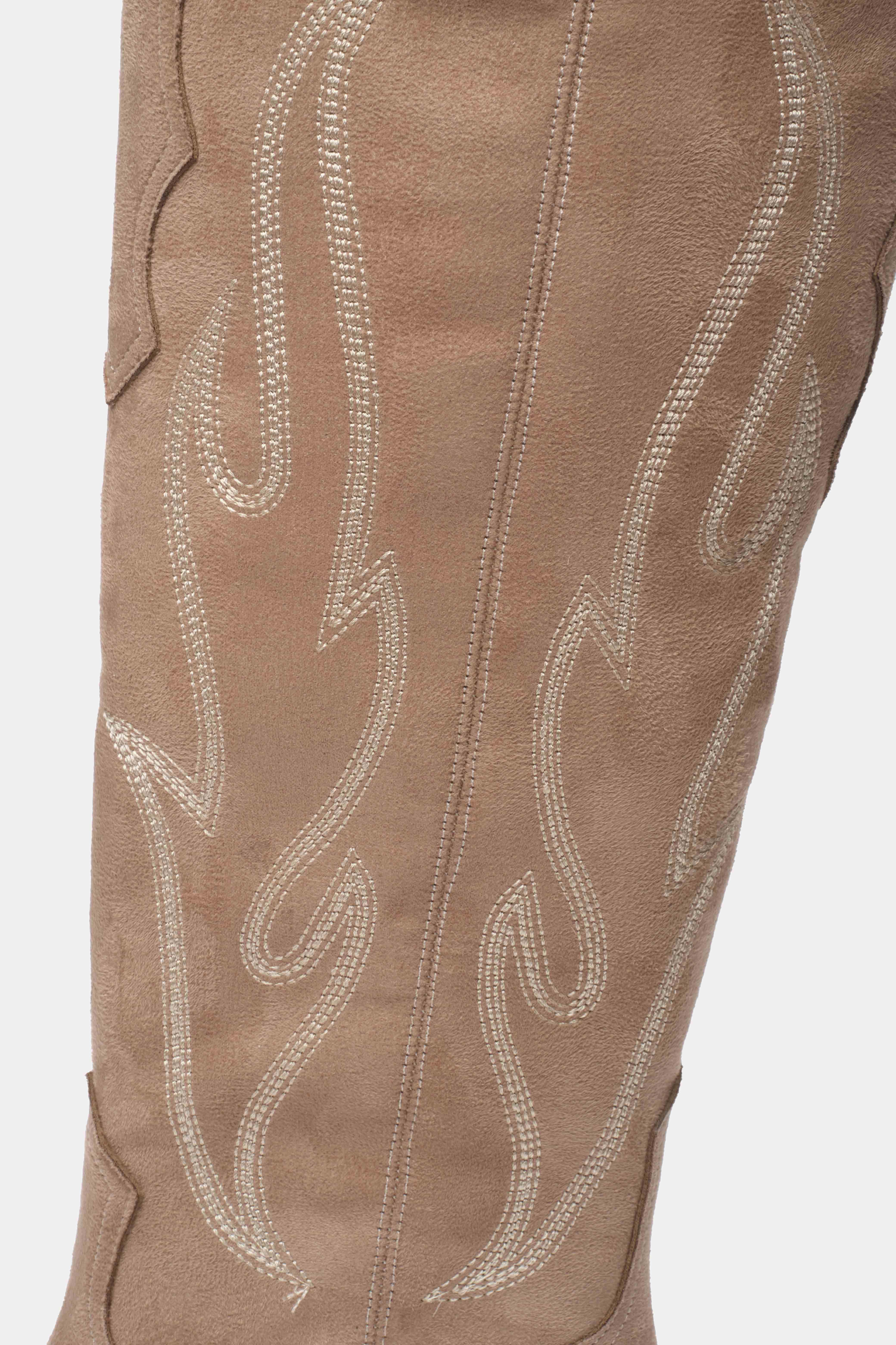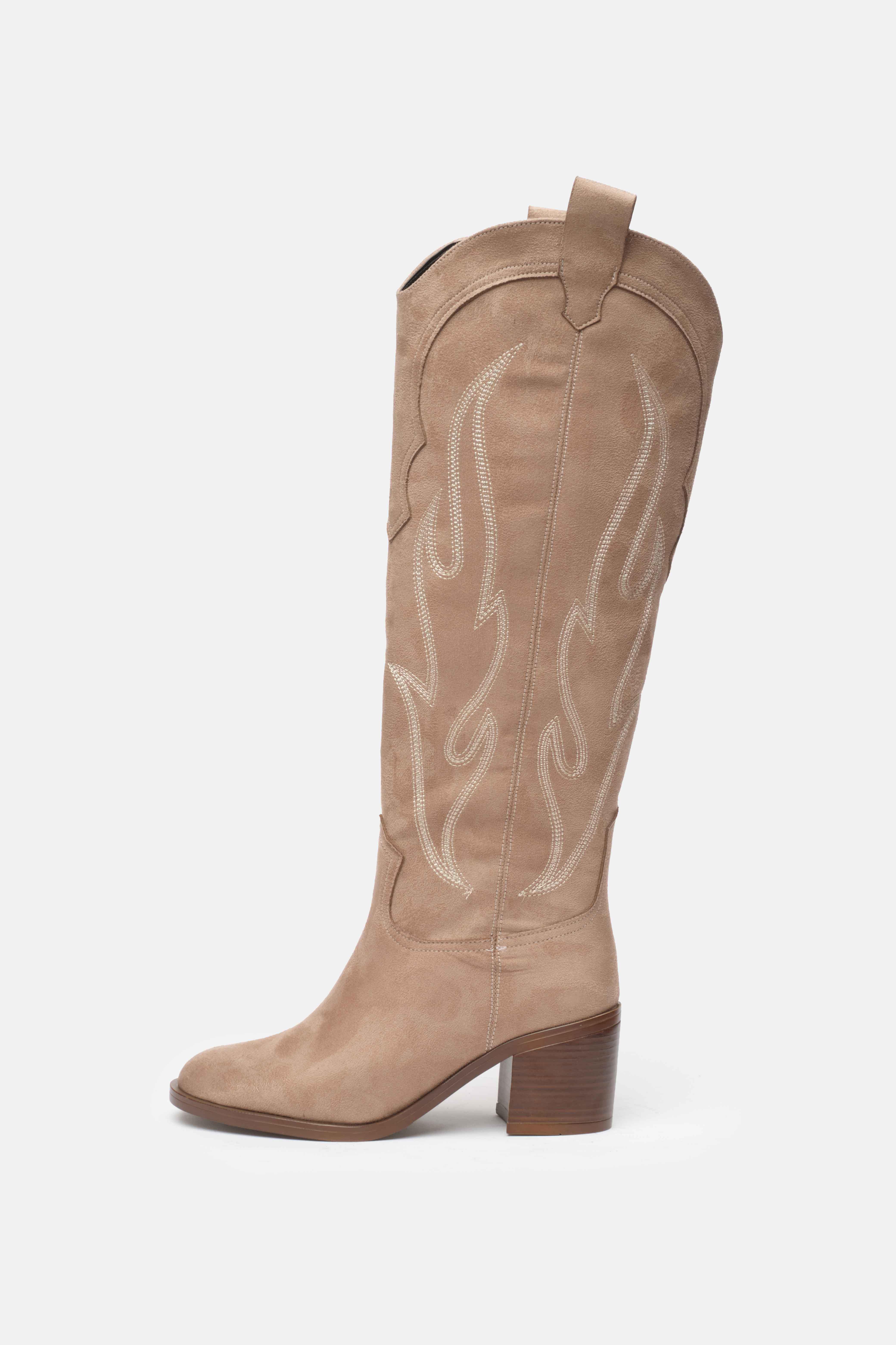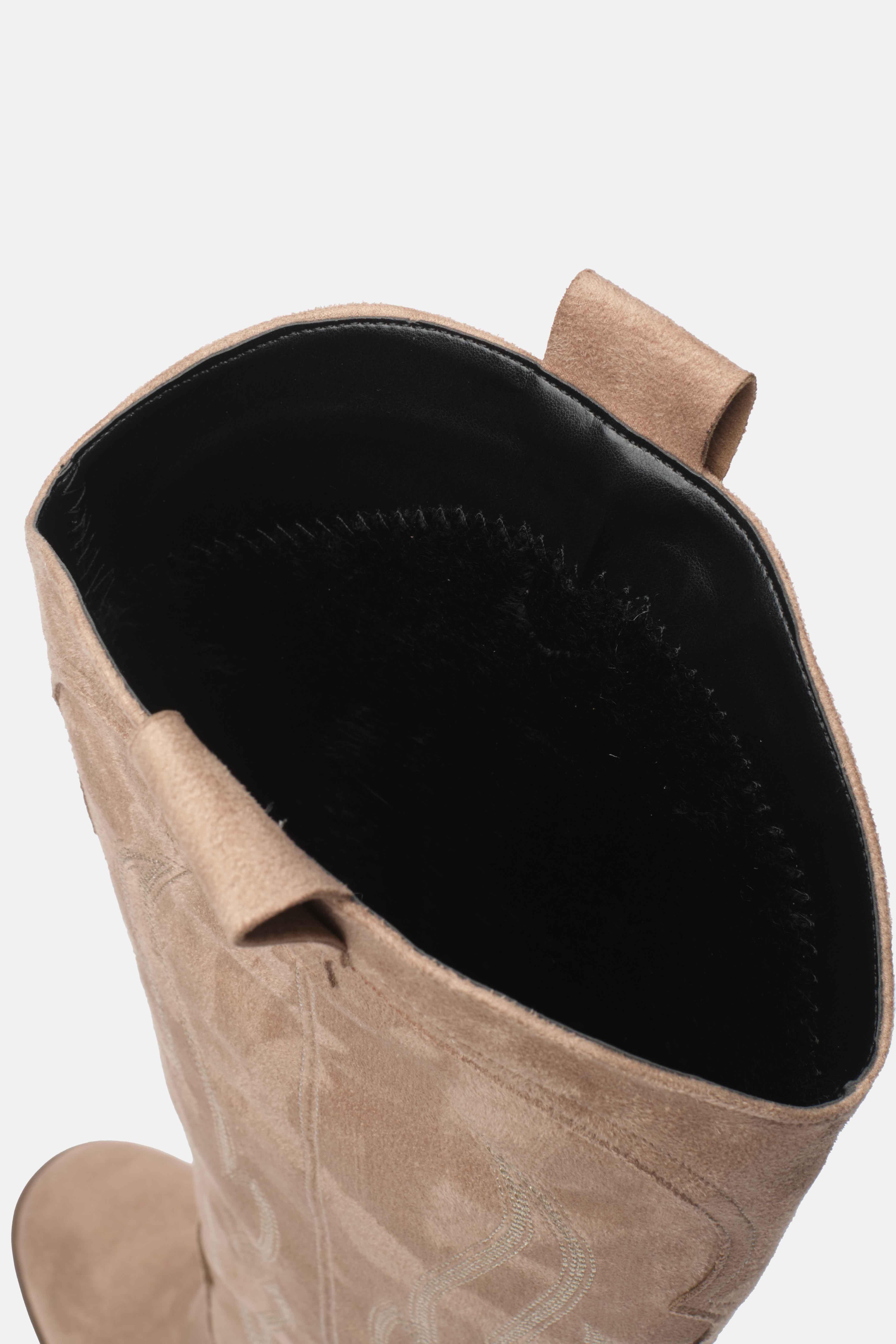Western esintili bu kovboy çizmesi, süet görünümlü kaliteli malzemesi ve dikkat çekici dikiş detaylarıyla şıklığı konforla buluşturuyor. Orta topuk boyu sayesinde gün boyu rahat kullanım sunarken, diz altına kadar uzanan tasarımı stilinizi güçlü bir şekilde tamamlar. Jean, etek ve elbiselerle kolayca kombinlenebilen bu çizme, modern ve zamansız bir görünüm arayanlar için ideal.