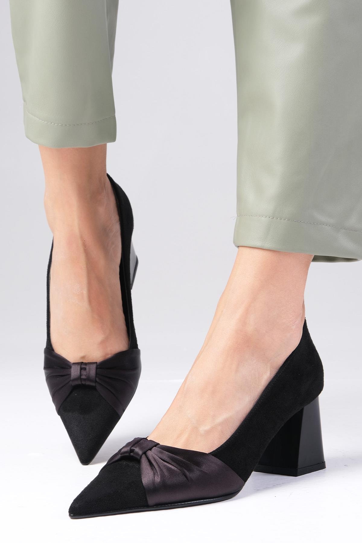 • Siyah renk süet , saten fiyonk aksesuarlı topuklu ayakkabı