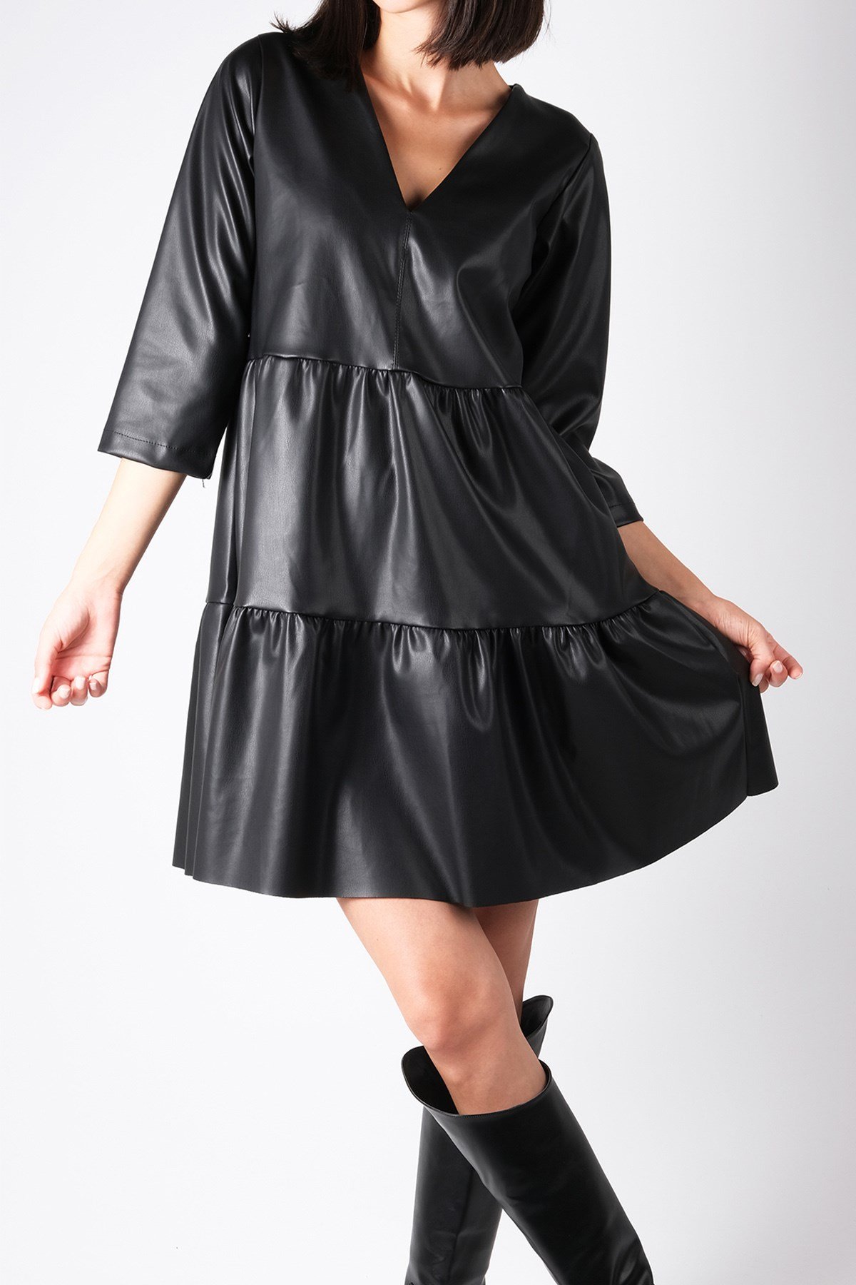 Siyah Renk Deri, V Yaka, Volanlı, Kadın Elbise 1.Kalite İthal Suni Deri den Üretilmiştir.