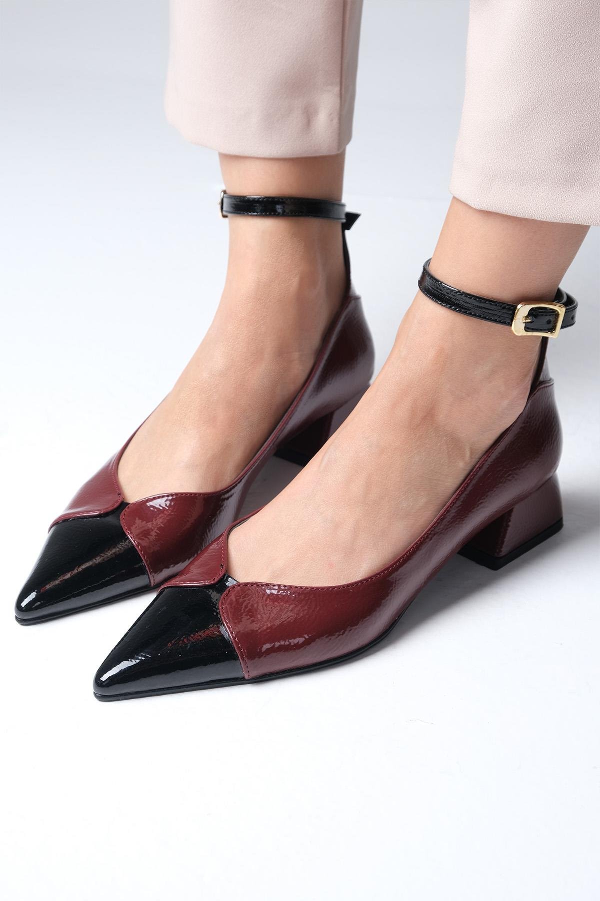 • Bordo renk rugan, kısa topuklu ayakkabı