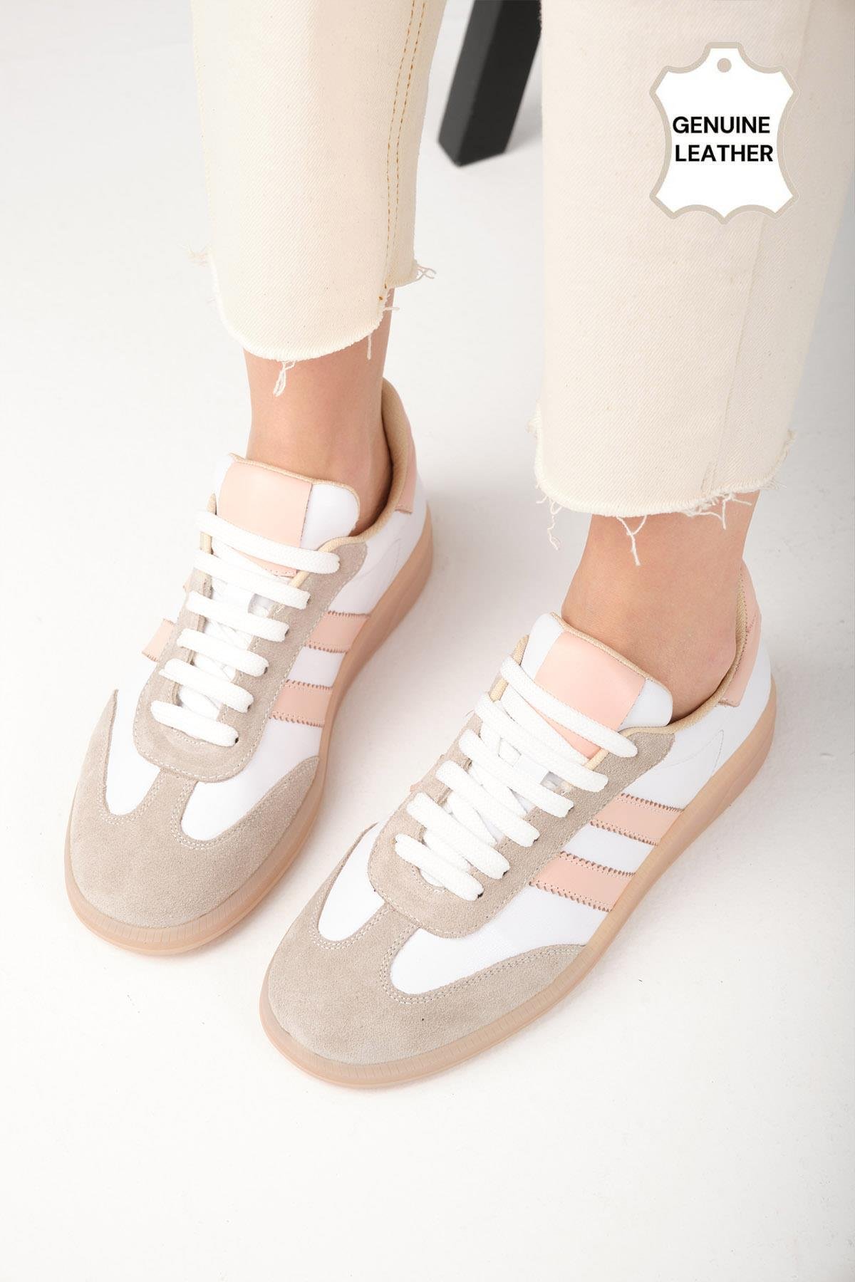• Hakiki Deri, Pudra Renk Şeritli Sneaker