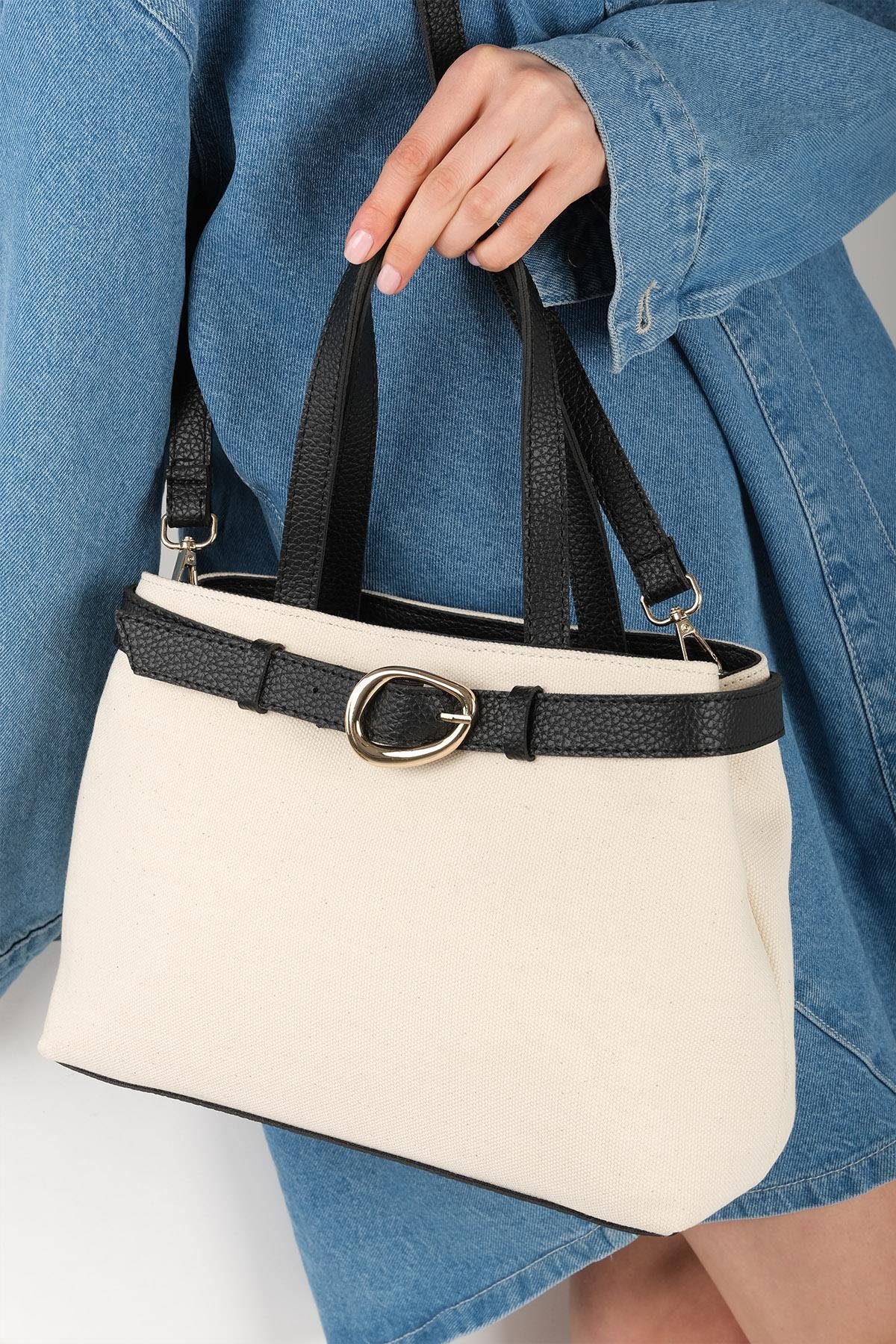 Toka detaylı krem kumaş kadın çantası, şıklığı ve konforu bir arada sunuyor. Siyah renkli deri saplarıyla modern bir görünüm kazanan bu çanta, hem elde hem omuzda taşınabilir çok yönlü tasarımıyla günlük ve ofis kombinlerinizi tamamlar. Geniş iç hacmi ve fermuarlı yapısı sayesinde hem şık hem de işlevsel bir kullanım