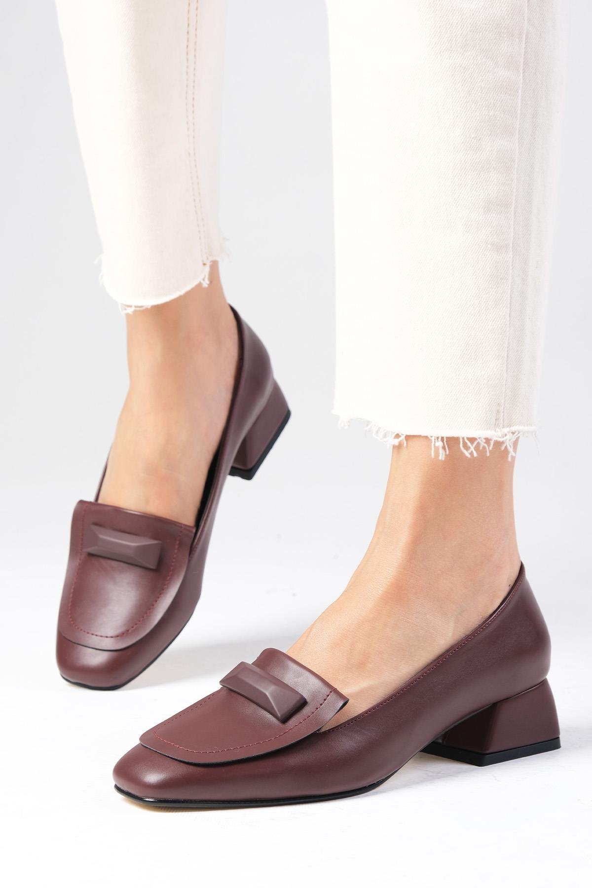 • Bordo renk küt burunlu kısa topuklu ayakkabı