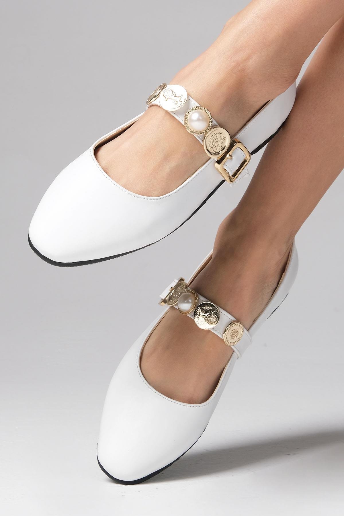 • Beyaz Renk,Toka Detaylı, Küt Burunlu Kadın Babet Ayakkabı