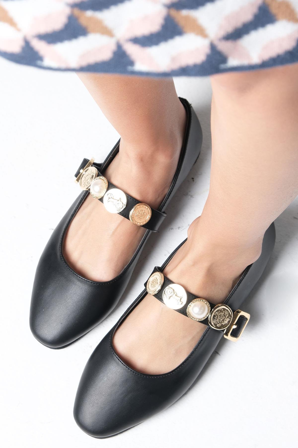•  Siyah Renk,Toka Detaylı, Küt Burunlu Kadın Babet Ayakkabı