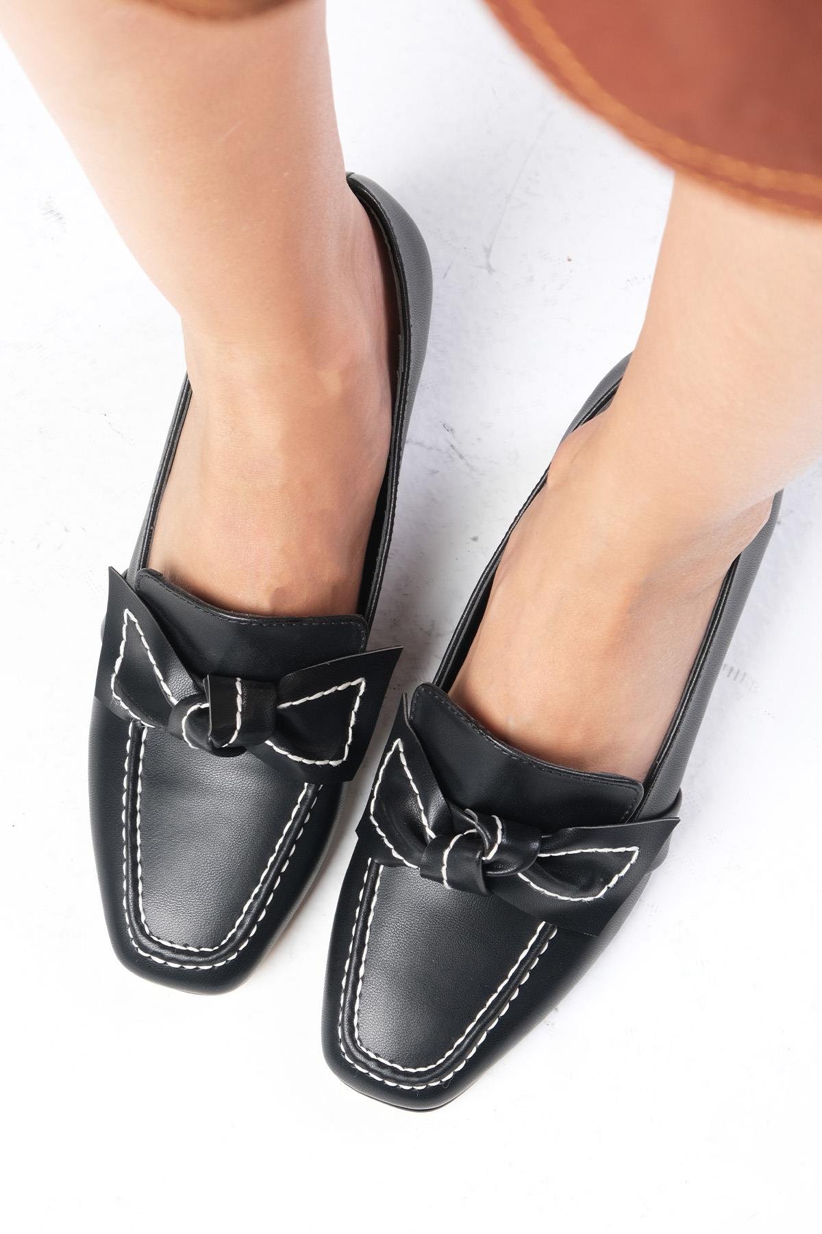• Siyah renk, fiyonk aksesuarlı kısa topuklu ayakkabı