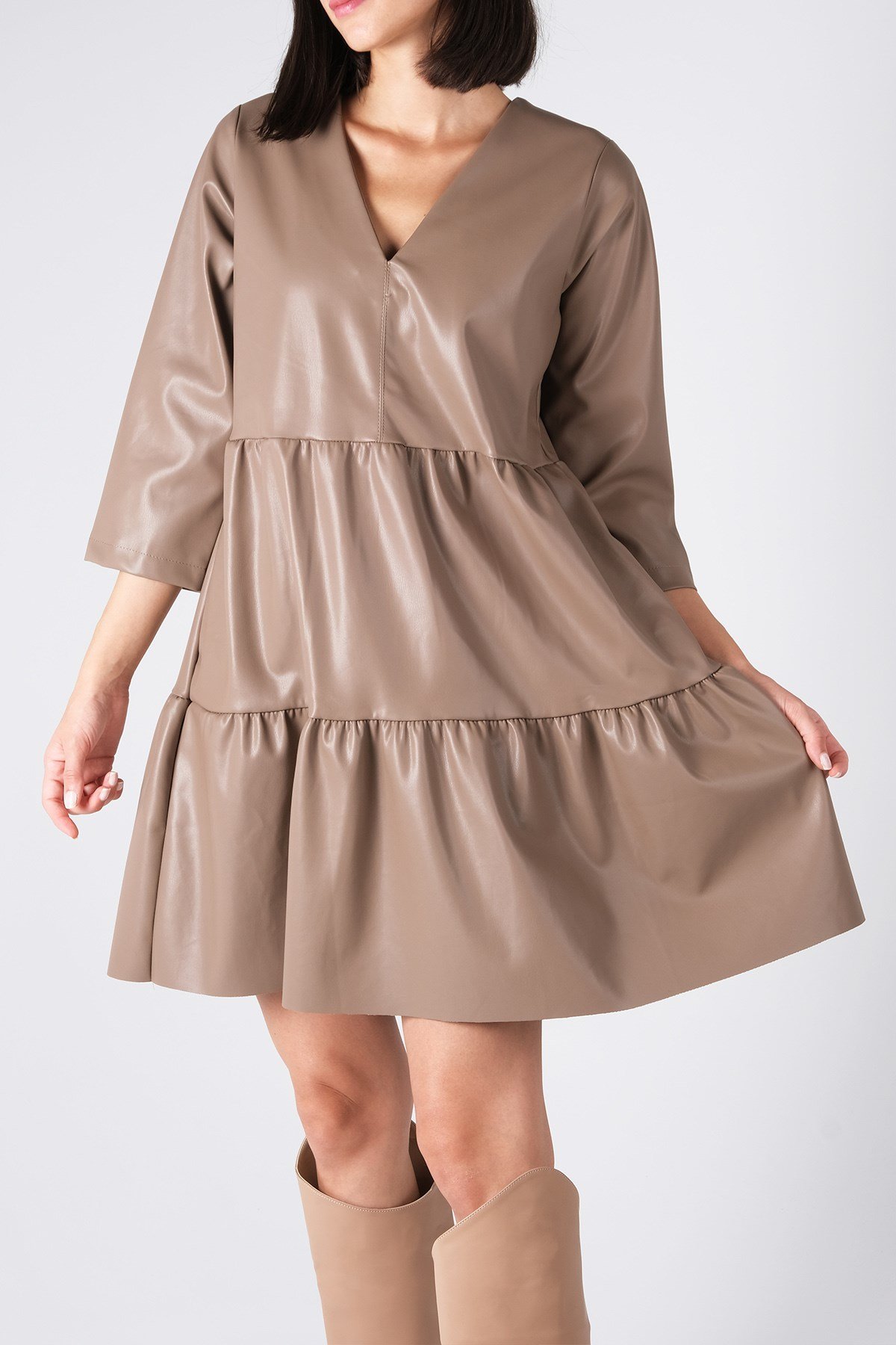 Vizon Renk Deri, V Yaka, Volanlı, Kadın Elbise 1.Kalite İthal Suni Deri den Üretilmiştir.